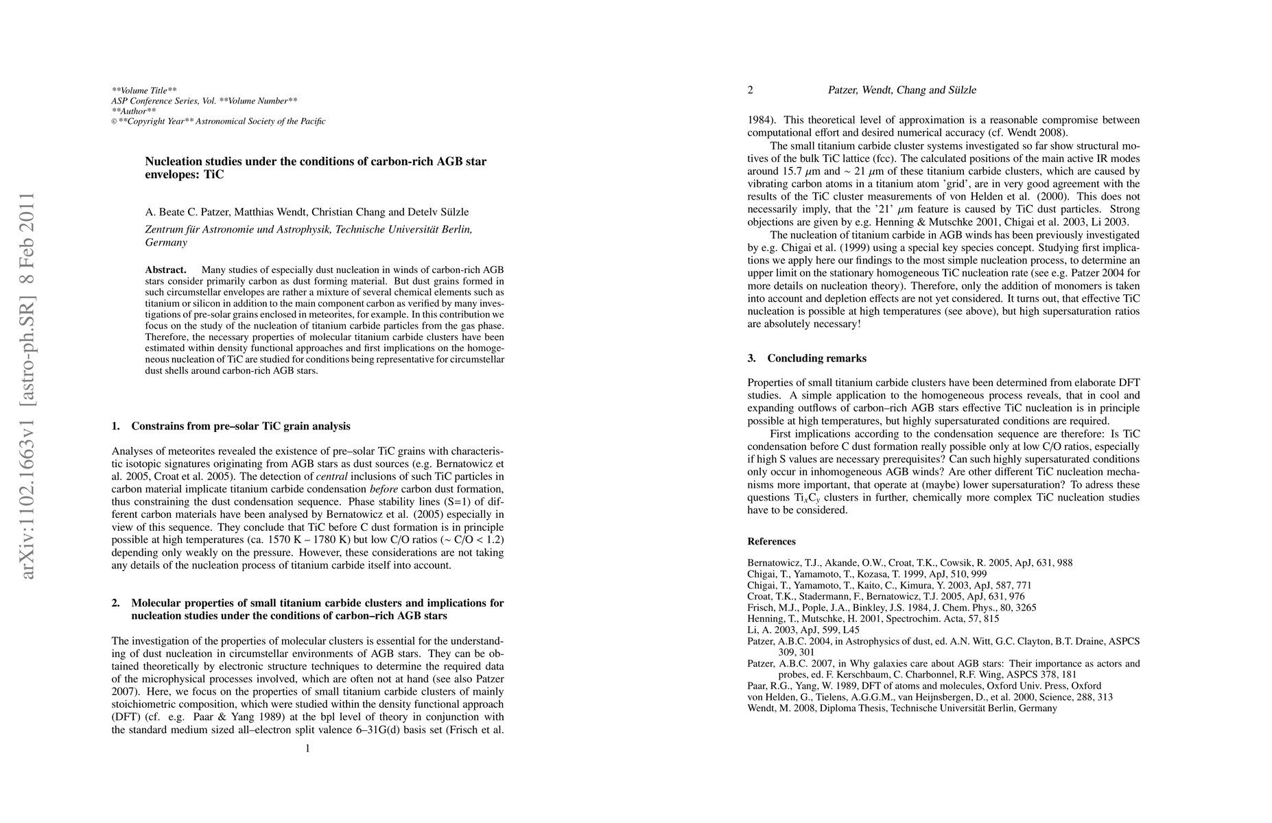 Many studies of especially dust nucleation in winds of carbon-rich AGB stars consider primarily carbon as dust forming material. But dust grains formed in such circumstellar envelopes are rather a mixture of several chemical elements such as titanium or silicon in addition to the main component carbon as verified by many investigations of pre-solar grains enclosed in meteorites, for example. In this contribution we focus on the study of the nucleation of titanium carbide particles from the gas phase. Therefore, the necessary properties of molecular titanium carbide clusters have been estimated within density functional approaches and first implications on the homogeneous nucleation of TiC are studied for conditions being representative for circumstellar dust shells around carbon-rich AGB stars.