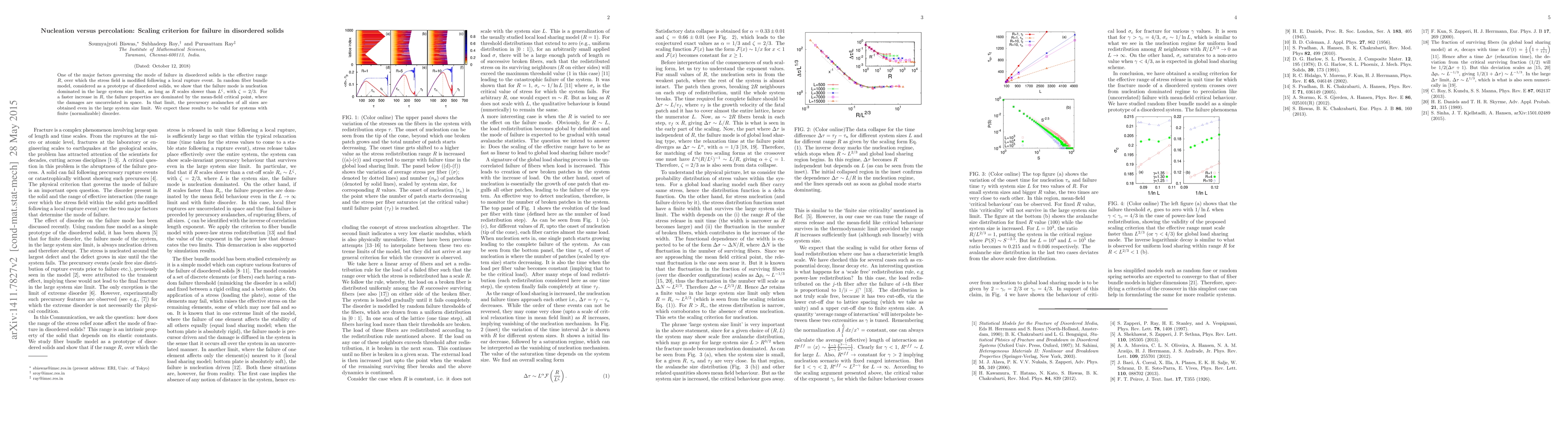 One of the major factors governing the mode of failure in disordered solids is the effective range $R$, over which the stress field is modified following a local rupture event. In random fiber bundle model, considered as a prototype of disordered solids, we show that the failure mode is nucleation dominated in the large system size limit, as long as $R$ scales slower than $L^{\zeta}$, with $\zeta=2/3$. For a faster increase in $R$, the failure properties are dominated by the mean-field critical point, where the damages are uncorrelated in space. In that limit, the precursory avalanches of all sizes are obtained even in the large system size limit. We expect these results to be valid for systems with finite (normalizable) disorder.