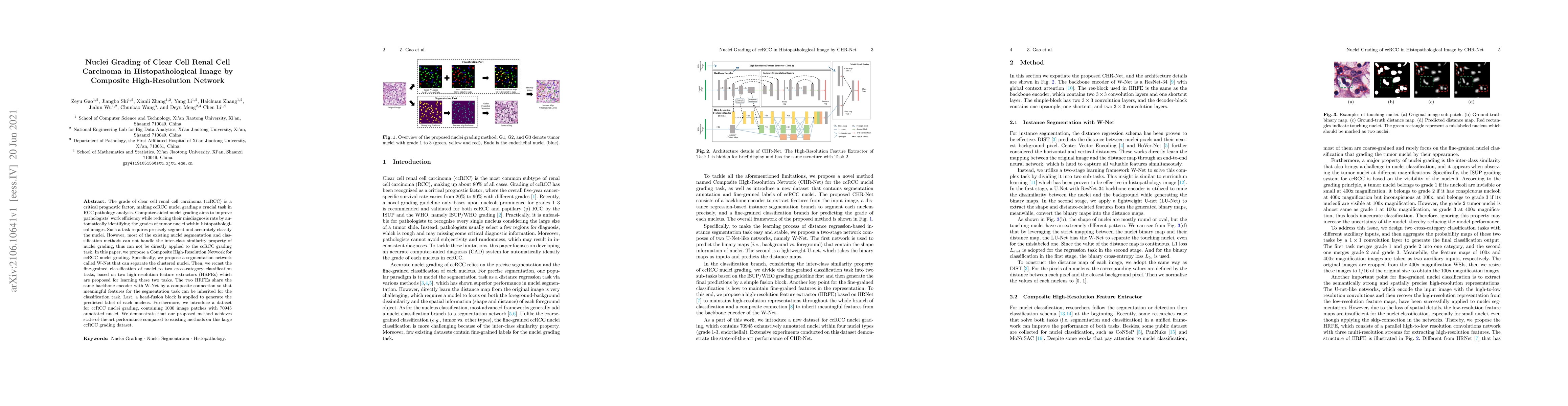 This paper proposes a Composite High-Resolution Network for grading nuclei in clear cell renal cell carcinoma (ccRCC) histopathological images, introducing a W-Net segmentation network and two high-resolution feature extractors to handle inter-class similarity. The method achieves state-of-the-art performance on a new dataset of 1000 image patches with 70,945 annotated nuclei.