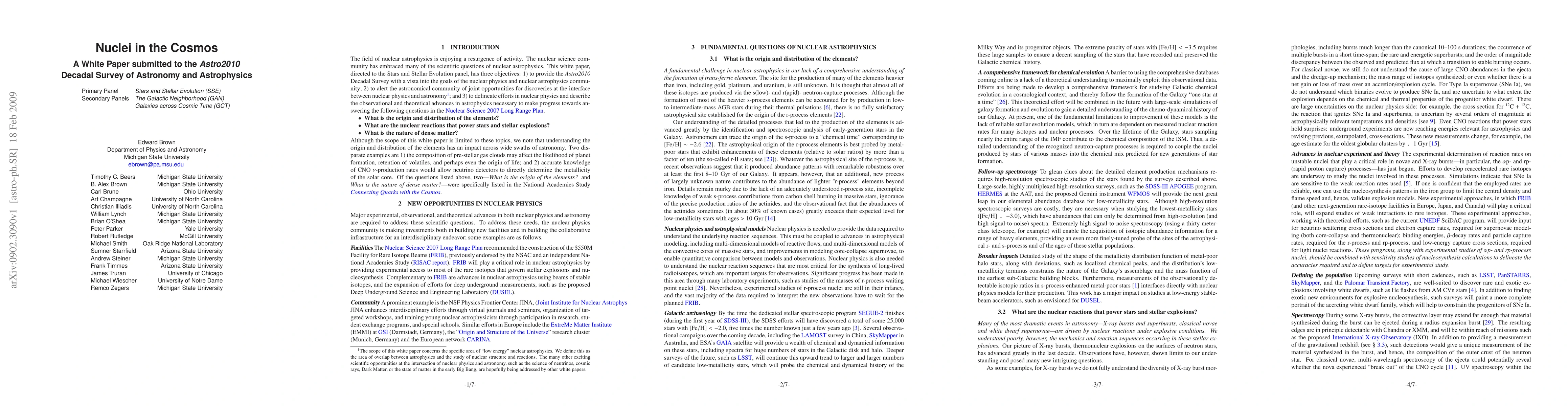 This white paper, directed to the Stars and Stellar Evolution panel, has three objectives: 1) to provide the Astro2010 Decadal Survey with a vista into the goals of the nuclear physics and nuclear astrophysics community; 2) to alert the astronomical community of joint opportunities for discoveries at the interface between nuclear physics and astronomy; and 3) to delineate efforts in nuclear physics and describe the observational and theoretical advances in astrophysics necessary to make progress towards answering the following questions in the Nuclear Science 2007 Long Range Plan: 1) What is the origin and distribution of the elements? 2) What are the nuclear reactions that power stars and stellar explosions? 3) What is the nature of dense matter? The scope of this white paper concerns the specific area of "low energy" nuclear astrophysics. We define this as the area of overlap between astrophysics and the study of nuclear structure and reactions. Of the questions listed above, two -- What is the origin of the elements? and What is the nature of dense matter? -- were specifically listed in the National Academies Study, "Connecting Quarks with the Cosmos".