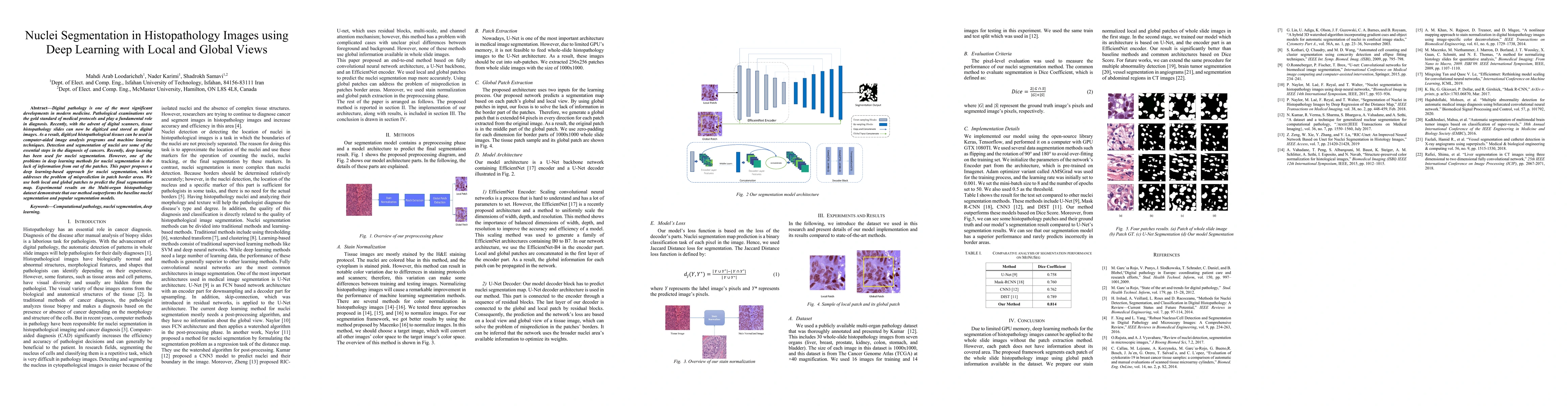 This paper proposes a deep learning method for nuclei segmentation in histopathology images, utilizing both local and global views to improve accuracy, especially in patch border areas. Experimental results show superior performance compared to baseline models and popular segmentation techniques on the Multi-organ histopathology dataset.