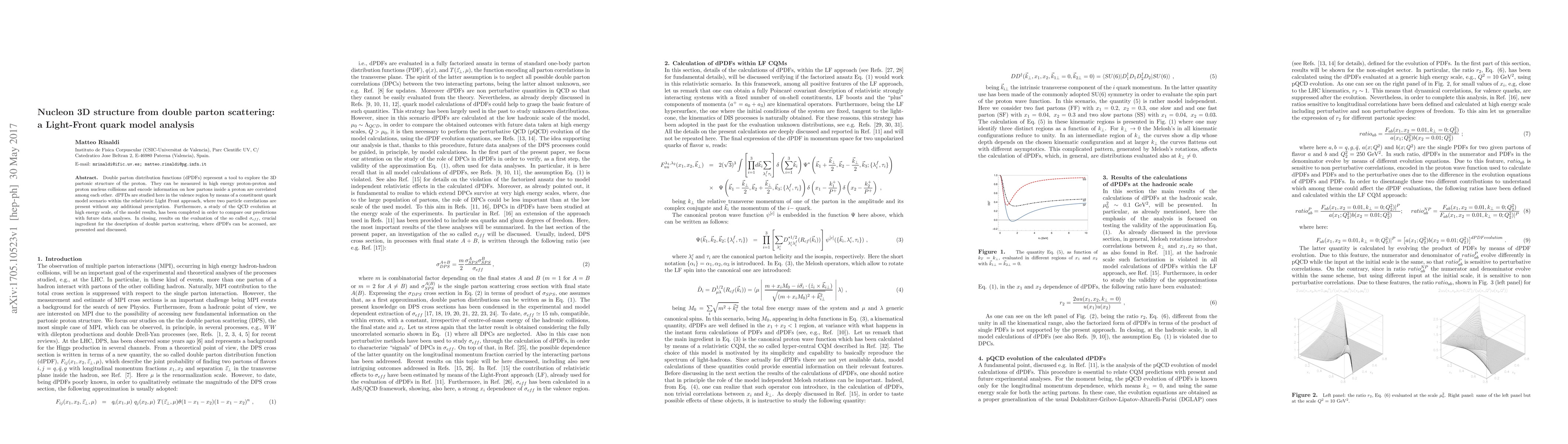 This paper investigates double parton distribution functions (dPDFs) using a Light-Front quark model to explore the 3D partonic structure of the proton, focusing on the valence region. The study also examines QCD evolution at high energy scales and presents results on the effective cross-section (\sigma_{eff}), essential for double parton scattering analysis.