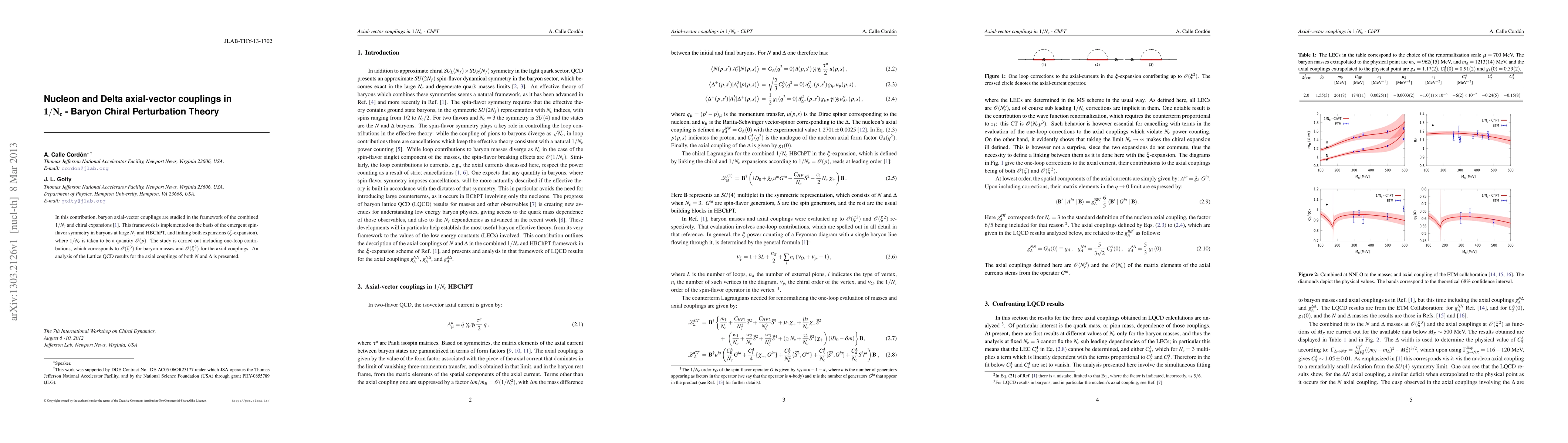 This paper investigates nucleon and Delta axial-vector couplings using 1/Nc baryon chiral perturbation theory, combining 1/Nc and chiral expansions based on emergent spin-flavor symmetry. It includes one-loop contributions and analyzes Lattice QCD results for N and Δ axial couplings.