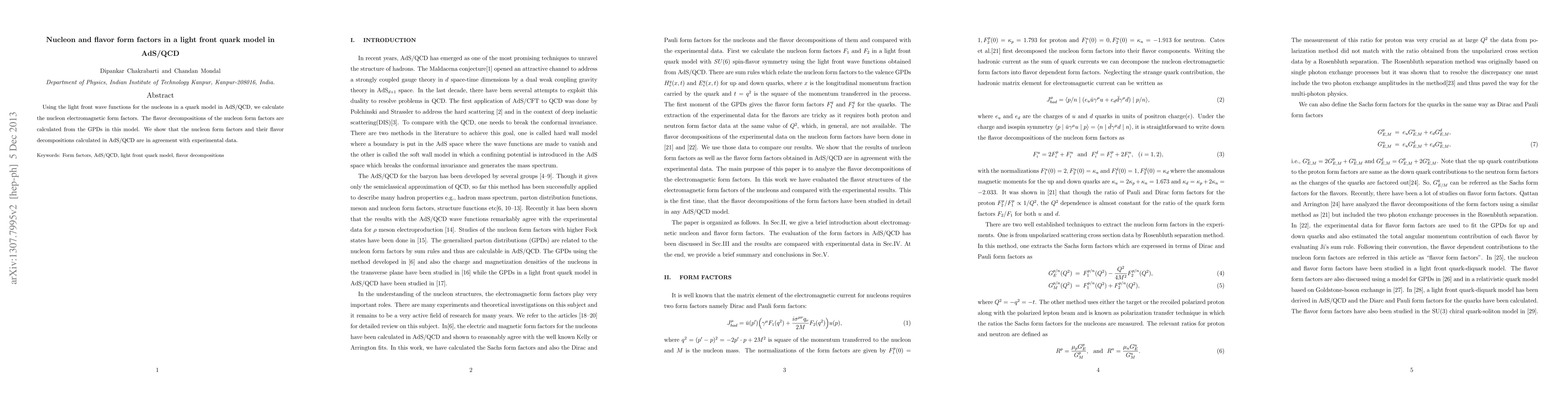 This paper calculates nucleon electromagnetic form factors using a light front quark model within the AdS/QCD framework, and demonstrates that these results align with experimental data, also providing flavor decompositions derived from Generalized Parton Distributions (GPDs).