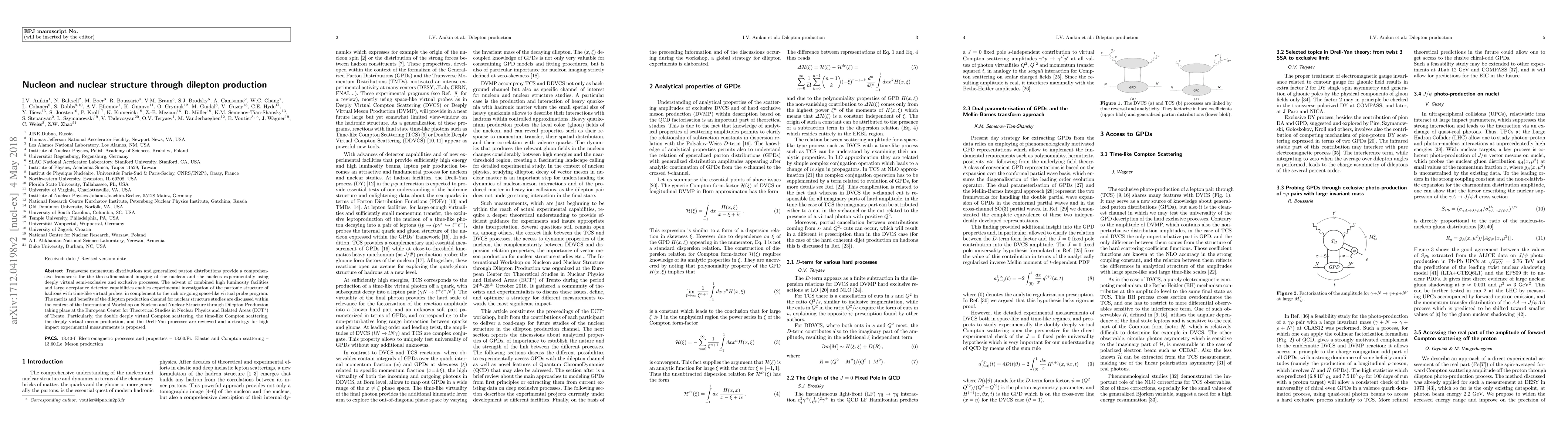 Transverse momentum distributions and generalized parton distributions provide a comprehensive framework for the three-dimensional imaging of the nucleon and the nucleus experimentally using deeply virtual semi-exclusive and exclusive processes. The advent of combined high luminosity facilities and large acceptance detector capabilities enables experimental investigation of the partonic structure of hadrons with time-like virtual probes, in complement to the rich on-going space-like virtual probe program. The merits and benefits of the dilepton production channel for nuclear structure studies are discussed within the context of the International Workshop on Nucleon and Nuclear Structure through Dilepton Production taking place at the European Center for Theoretical Studies in Nuclear Physics and Related Areas (ECT$^{\star}$) of Trento. Particularly, the double deeply virtual Compton scattering, the time-like Compton scattering, the deeply virtual meson production, and the Drell-Yan processes are reviewed and a strategy for high impact experimental measurements is proposed.