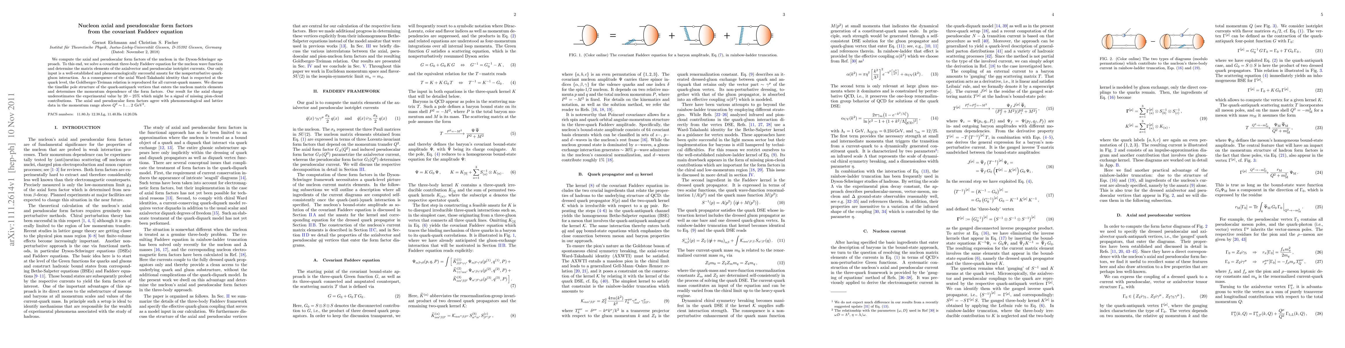 This paper computes nucleon axial and pseudoscalar form factors using the covariant Faddeev equation within the Dyson-Schwinger approach, achieving agreement with phenomenological and lattice data for high momentum transfers. The study highlights discrepancies in the axial charge, suggesting potential pion-cloud contributions.