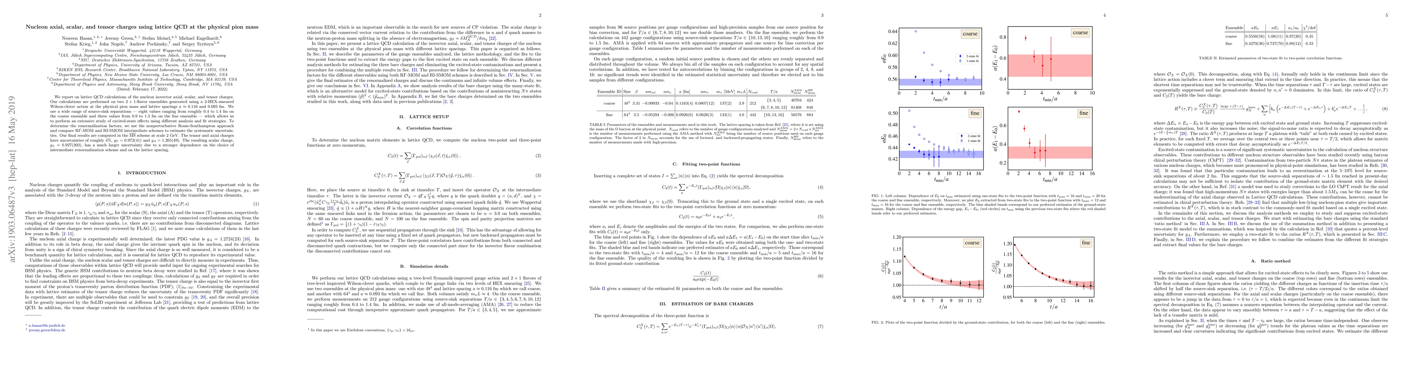 We report on lattice QCD calculations of the nucleon isovector axial, scalar, and tensor charges. Our calculations are performed on two 2+1-flavor ensembles generated using a 2-HEX-smeared Wilson-clover action at the physical pion mass and lattice spacings $a\approx$ 0.116 and 0.093 fm. We use a wide range of source-sink separations - eight values ranging from roughly 0.4 to 1.4 fm on the coarse ensemble and three values from 0.9 to 1.5 fm on the fine ensemble - which allows us to perform an extensive study of excited-state effects using different analysis and fit strategies. To determine the renormalization factors, we use the nonperturbative Rome-Southampton approach and compare RI'-MOM and RI-SMOM intermediate schemes to estimate the systematic uncertainties. Our final results are computed in the MS-bar scheme at scale 2 GeV. The tensor and axial charges have uncertainties of roughly 4%, $g_T=0.972(41)$ and $g_A=1.265(49)$. The resulting scalar charge, $g_S=0.927(303)$, has a much larger uncertainty due to a stronger dependence on the choice of intermediate renormalization scheme and on the lattice spacing.