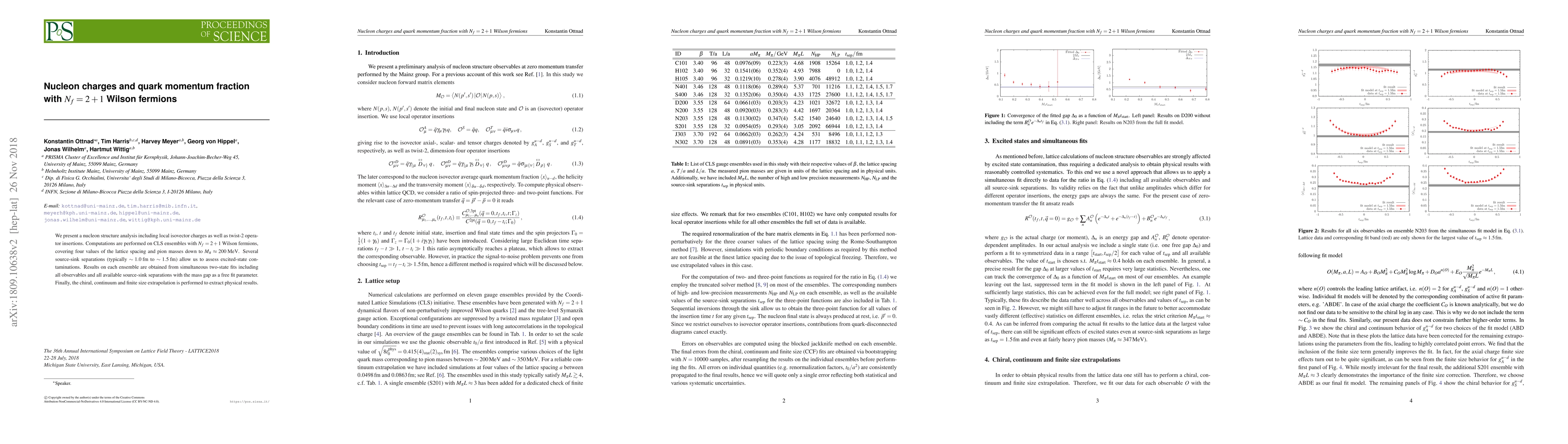 We present a nucleon structure analysis including local isovector charges as well as twist-2 operator insertions. Computations are performed on CLS ensembles with $N_f=2+1$ Wilson fermions, covering four values of the lattice spacing and pion masses down to $M_\pi \approx 200\,\mathrm{MeV}$. Several source-sink separations (typically $\sim 1.0\,\mathrm{fm}$ to $\sim 1.5\,\mathrm{fm}$) allow us to assess excited-state contaminations. Results on each ensemble are obtained from simultaneous two-state fits including all observables and all available source-sink separations with the mass gap as a free fit parameter. Finally, the chiral, continuum and finite size extrapolation is performed to extract physical results.
