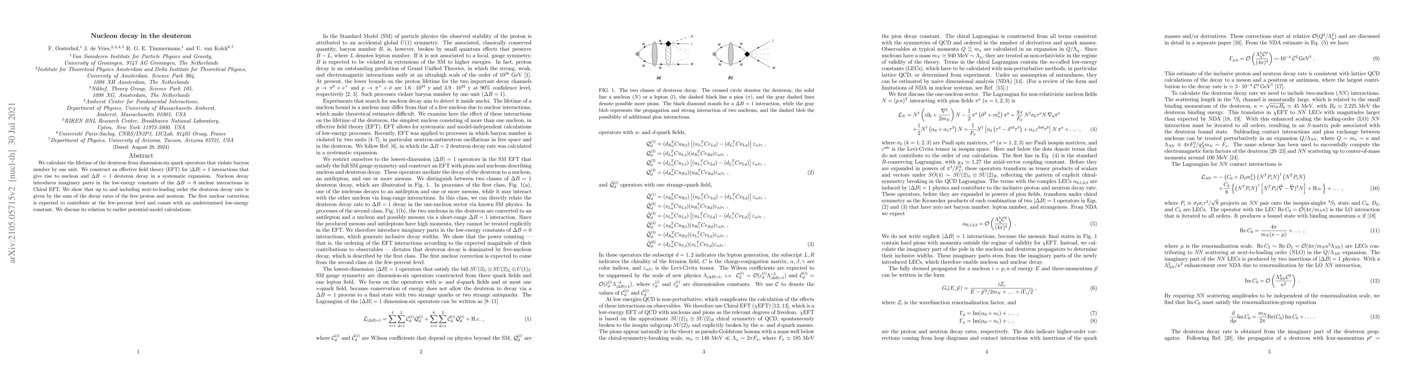 We calculate the lifetime of the deuteron from dimension-six quark operators that violate baryon number by one unit. We construct an effective field theory for $|\Delta B|=1$ interactions that give rise to nucleon and $\Delta B=1$ deuteron decay in a systematic expansion. We show that up to and including next-to-leading order the deuteron decay rate is given by the sum of the decay rates of the free proton and neutron. The first nuclear correction is expected to contribute at the few-percent level and comes with an undetermined low-energy constant. We discuss its relation to earlier potential-model calculations.