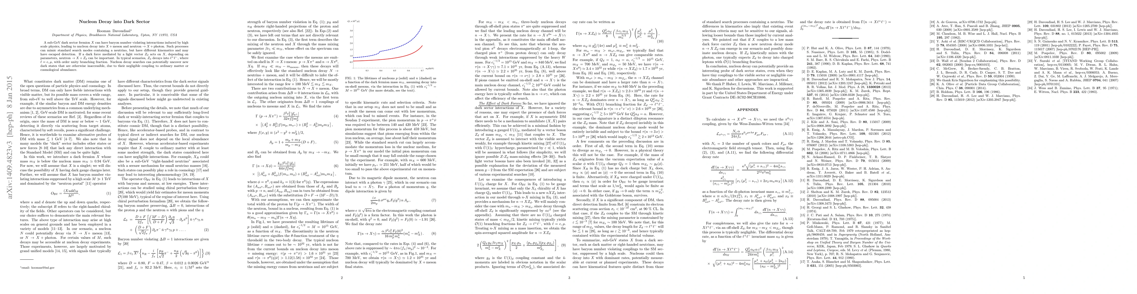 This paper explores nucleon decay into dark sector particles, specifically a sub-GeV dark fermion X, which can result from baryon number violating interactions. It highlights potential detection challenges due to the unique kinematic signatures of these decays compared to standard processes, and suggests that nucleon decay searches could reveal new dark states through interactions mediated by a light vector Z_d.