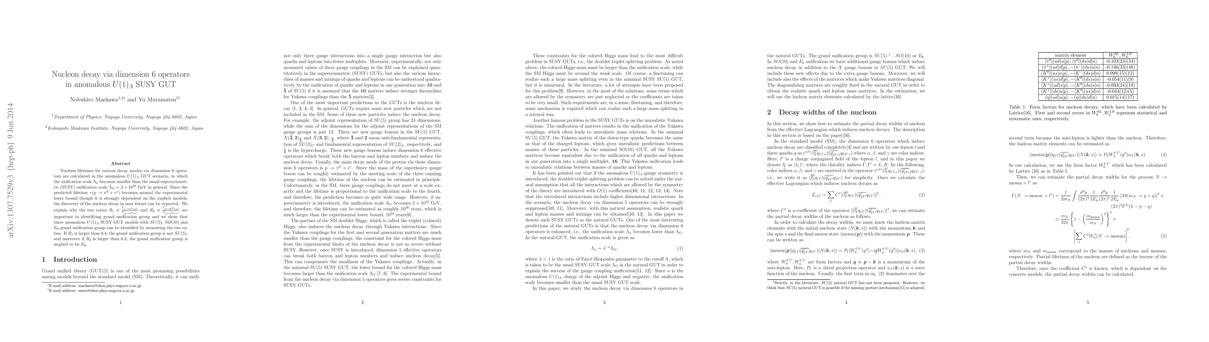 This paper calculates nucleon decay lifetimes via dimension 6 operators in an anomalous $U(1)_A$ supersymmetric grand unified theory (SUSY GUT) where the unification scale is lower than usual. It predicts nucleon decay rates near experimental lower bounds and discusses the significance of two ratios in determining the grand unification group, identifying $SU(5)$, $SO(10)$, and $E_6$ models based on these ratios.