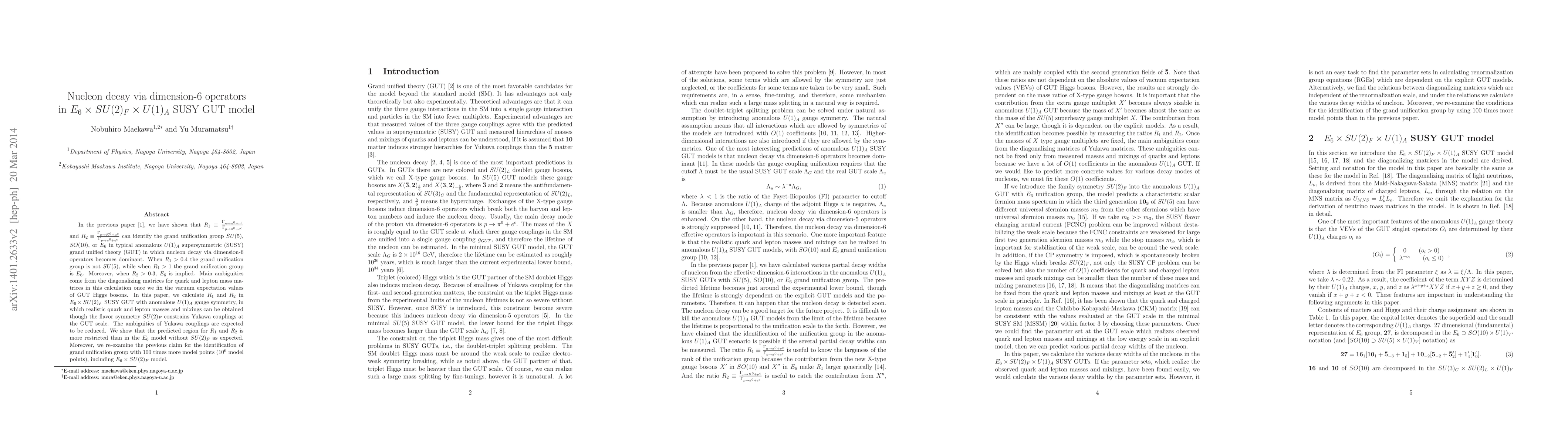 This paper calculates the ratios $R_1$ and $R_2$ for nucleon decay in an $E_6 \times SU(2)_F$ SUSY GUT model with anomalous $U(1)_A$ symmetry, aiming to identify the grand unification group. It finds that the predicted values for $R_1$ and $R_2$ are more restricted compared to the $E_6$ model alone, reducing ambiguities in Yukawa couplings.