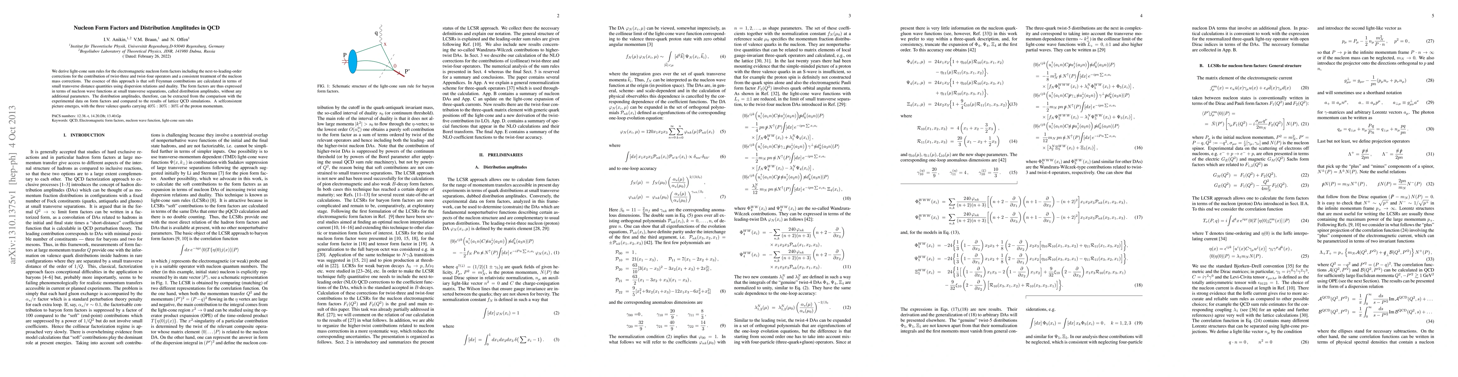 The research employs light-cone sum rules (LCSRs) to derive electromagnetic nucleon form factors, incorporating next-to-leading-order (NLO) corrections for twist-three and twist-four operators, and a consistent treatment of nucleon mass corrections. Soft Feynman contributions are calculated using dispersion relations and duality, expressing form factors in terms of nucleon wave functions at small transverse separations, known as distribution amplitudes.