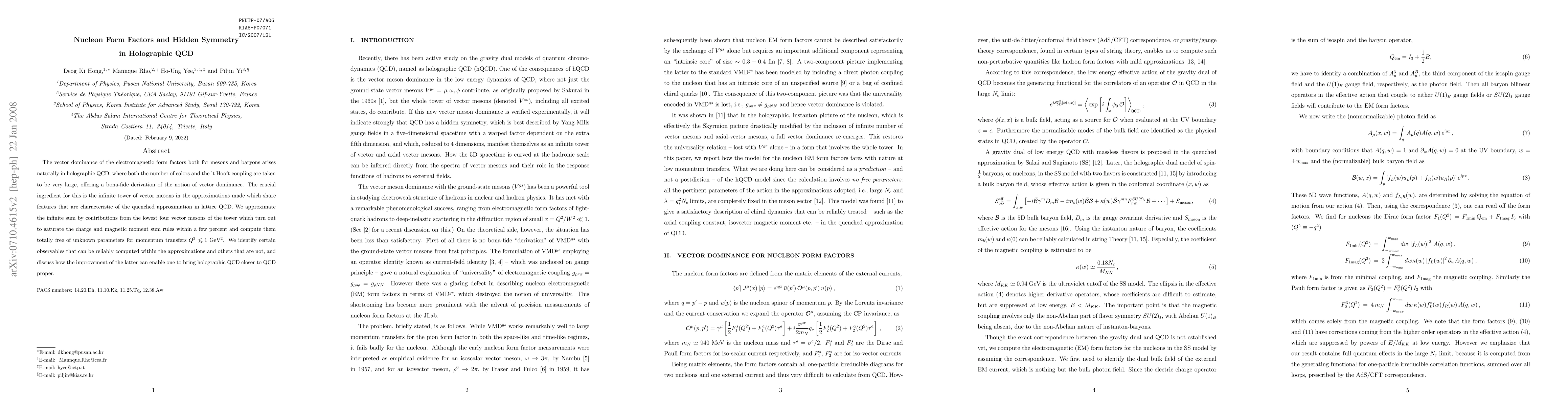 The vector dominance of the electromagnetic form factors both for mesons and baryons arises naturally in holographic QCD, where both the number of colors and the 't Hooft coupling are taken to be very large, offering a bona-fide derivation of the notion of vector dominance. The crucial ingredient for this is the infinite tower of vector mesons in the approximations made which share features that are characteristic of the quenched approximation in lattice QCD. We approximate the infinite sum by contributions from the lowest four vector mesons of the tower which turn out to saturate the charge and magnetic moment sum rules within a few percent and compute them totally free of unknown parameters for momentum transfers Q^2 less than 1GeV^2. We identify certain observables that can be reliably computed within the approximations and others that are not, and discuss how the improvement of the latter can enable one to bring holographic QCD closer to QCD proper.