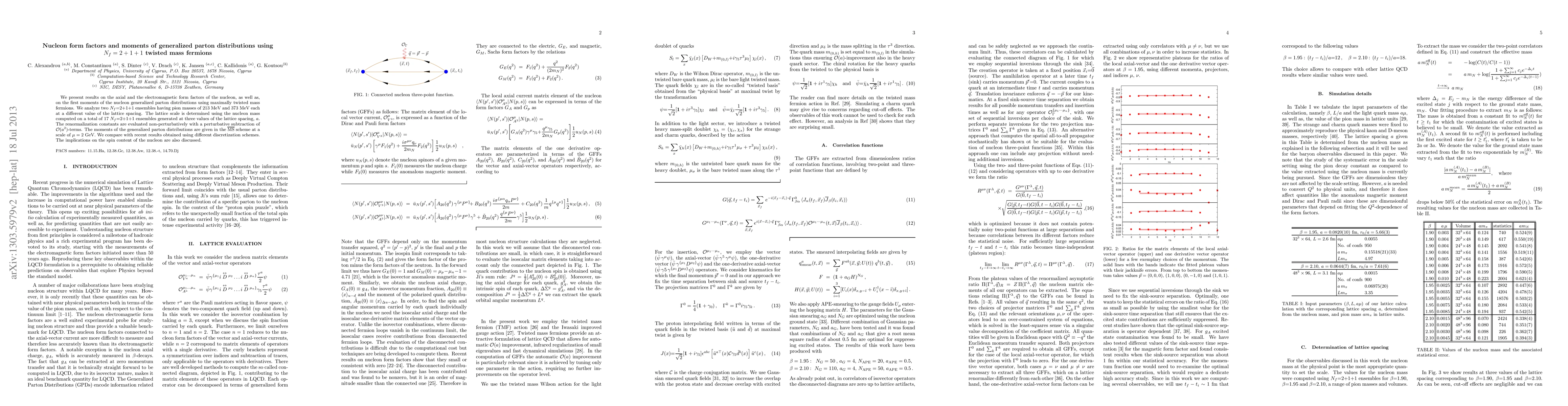 This paper reports on nucleon form factors and the first moments of generalized parton distributions using $N_f=2+1+1$ twisted mass fermions, analyzing two ensembles at different pion masses and lattice spacings. The study employs non-perturbative renormalization and compares results with other discretization schemes, discussing implications for the nucleon's spin content.