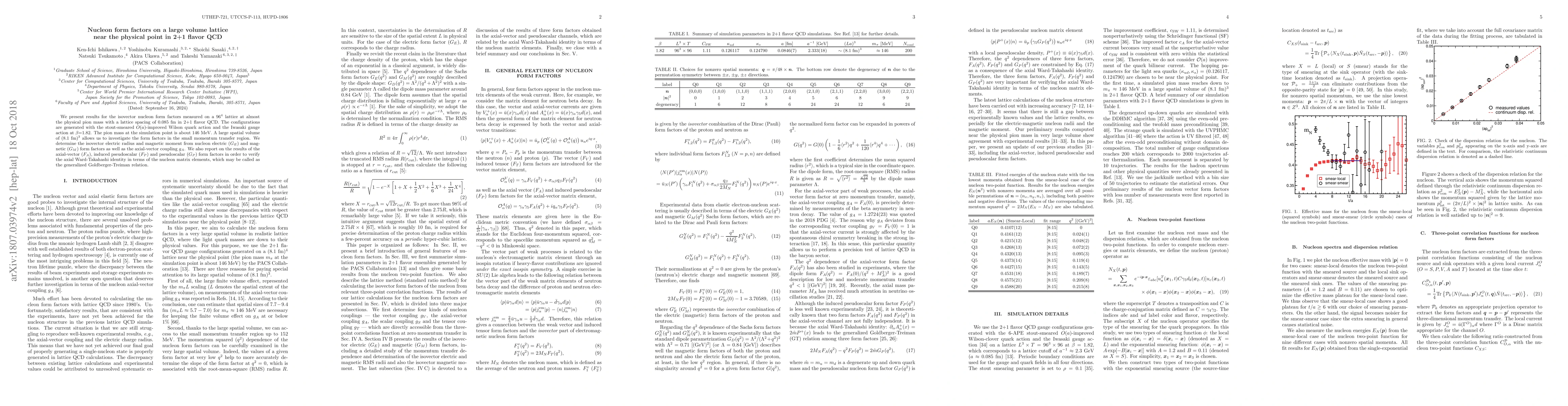 This study reports nucleon form factors in 2+1 flavor QCD on a $96^4$ lattice with a spatial volume of $(8.1~{\rm fm})^3$ and pion mass around 146 MeV. The results include the isovector electric radius, magnetic moment, and axial-vector coupling $g_A$, alongside verification of the axial Ward-Takahashi identity.