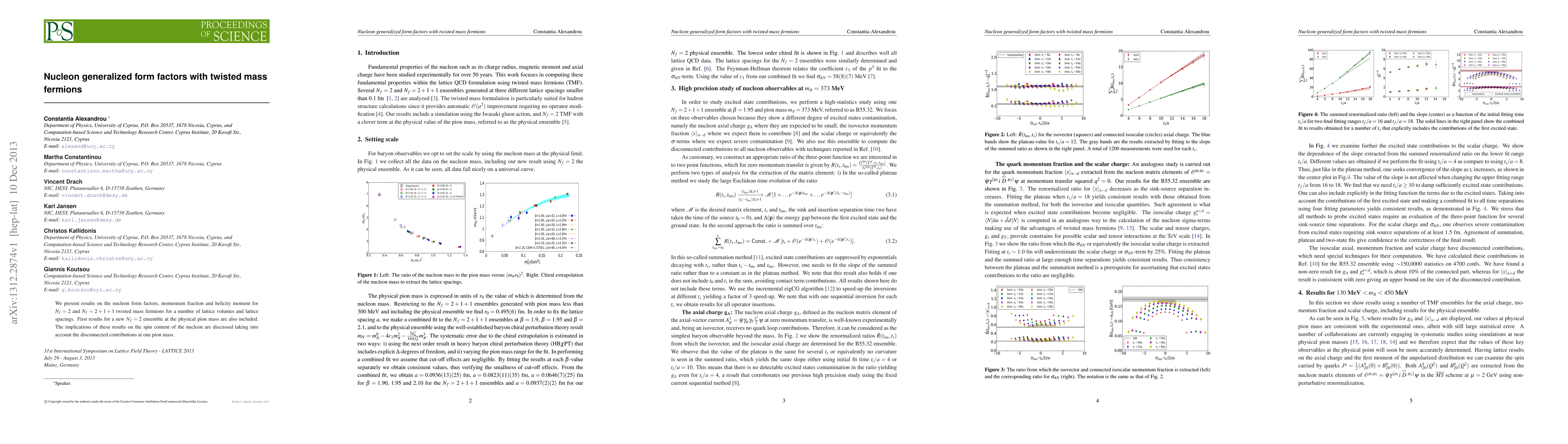 The research uses lattice QCD with twisted mass fermions (TMF) to compute fundamental nucleon properties such as charge radius, magnetic moment, and axial charge. They analyze several Nf=2 and Nf=2+1+1 ensembles at lattice spacings smaller than 0.1fm, employing the Iwasaki gluon action and a clover term for Nf=2 TMF at the physical pion mass.