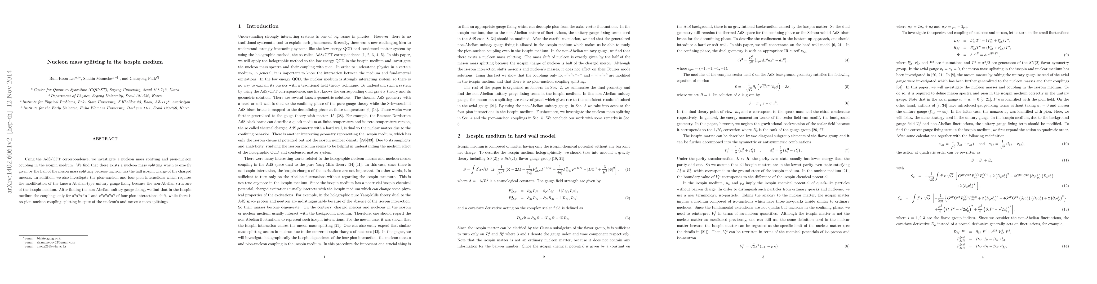 This paper uses the AdS/CFT correspondence to study nucleon mass splitting and nucleon-pion coupling in an isospin medium, finding that the nucleon mass splitting is half the meson mass splitting due to its isospin charge. It also modifies the unitary gauge fixing term to account for non-Abelian fluctuations, concluding that despite mass splittings, there is no nucleon-pion coupling splitting in the medium.