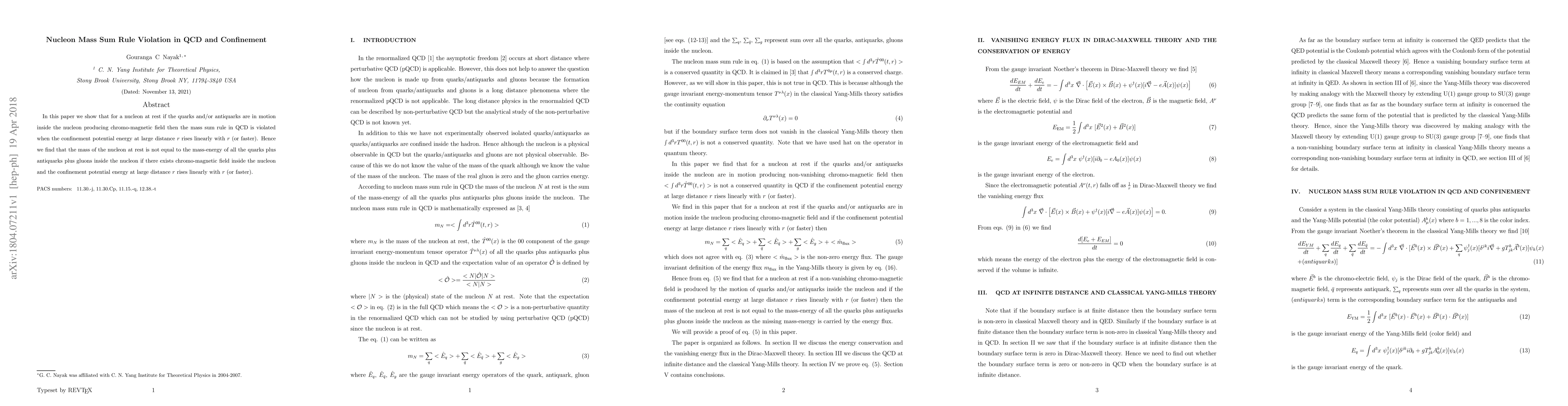 The QCD mass sum rule is violated when quarks/antiquarks inside a nucleon produce a chromo-magnetic field, resulting in non-conservation of mass-energy at rest. The confinement potential energy's rise with distance affects the violation's severity.