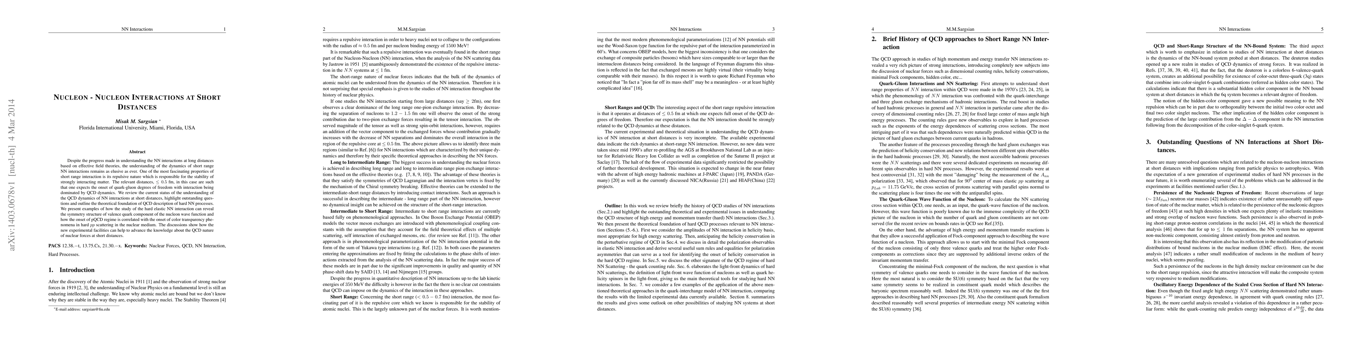 This review is crucial for advancing the understanding of QCD dynamics of strong forces at short distances, as new experiments in both hard NN scattering processes and NN short-range correlations in nuclei will provide necessary ground for this advancement.