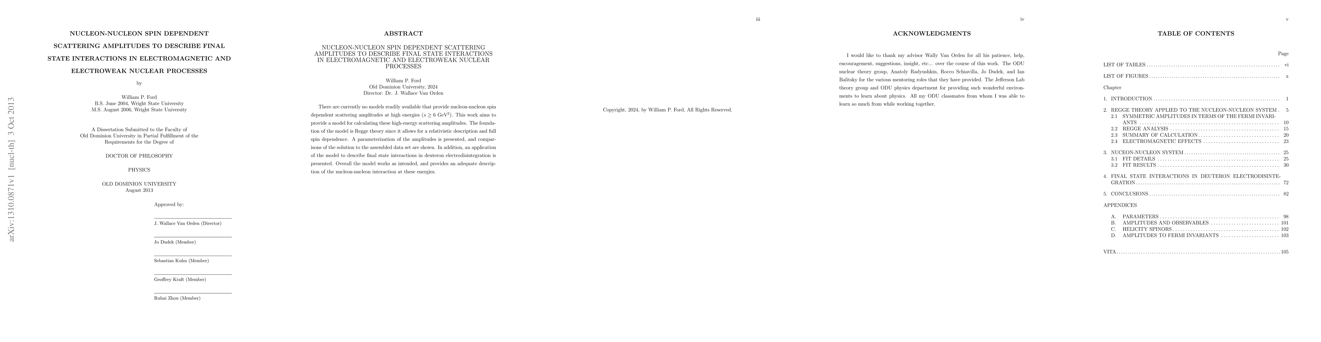 There are currently no models readily available that provide nucleon-nucleon spin dependent scattering amplitudes at high energies ($s \geq 6$ GeV$^2$). This work aims to provide a model for calculating these high-energy scattering amplitudes. The foundation of the model is Regge theory since it allows for a relativistic description and full spin dependence. A parameterization of the amplitudes is presented, and comparisons of the solution to the assembled data set are shown. In addition, an application of the model to describe final state interactions in deuteron electrodisintegration is presented. Overall the model works as intended, and provides an adequate description of the nucleon-nucleon interaction at these energies.