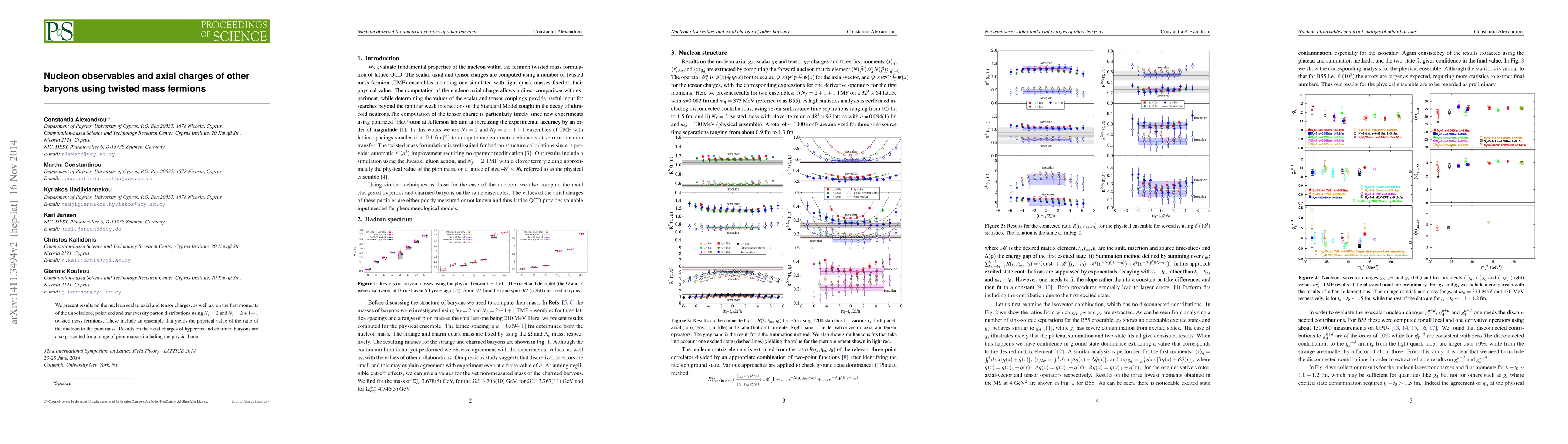We present results on the nucleon scalar, axial and tensor charges, as well as, on the first moments of the unpolarized, polarized and transversity parton distributions using $N_f=2$ and $N_f=2+1+1$ twisted mass fermions. These include an ensemble that yields the physical value of the ratio of the nucleon to the pion mass. Results on the axial charges of hyperons and charmed baryons are also presented for a range of pion masses including the physical one.