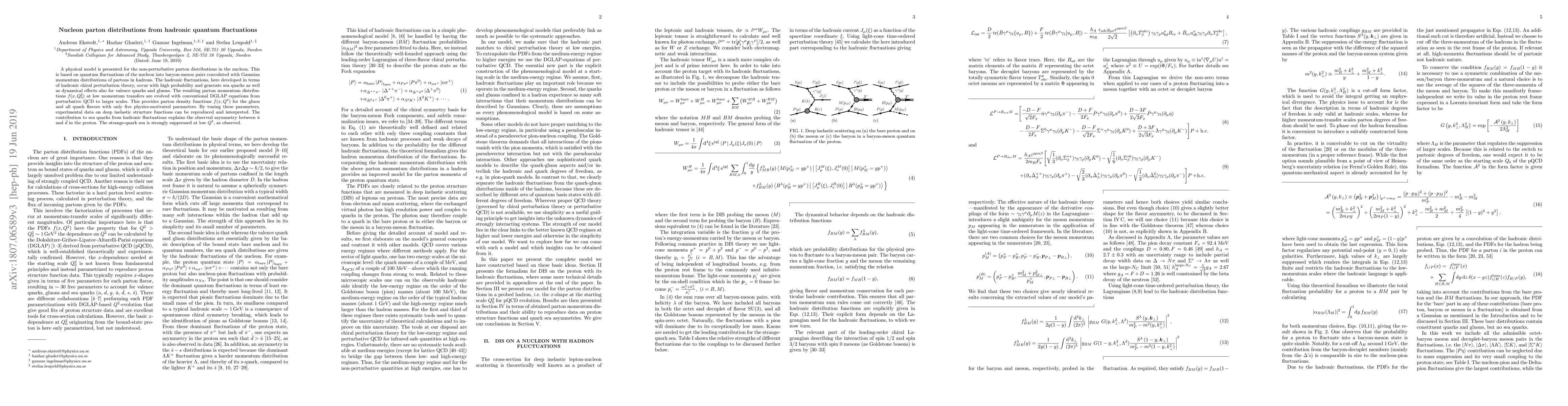 A physical model is presented for the non-perturbative parton distributions in the nucleon. This is based on quantum fluctuations of the nucleon into baryon-meson pairs convoluted with Gaussian momentum distributions of partons in hadrons. The hadronic fluctuations, here developed in terms of hadronic chiral perturbation theory, occur with high probability and generate sea quarks as well as dynamical effects also for valence quarks and gluons. The resulting parton momentum distributions $f(x,Q_0^2)$ at low momentum transfers are evolved with conventional DGLAP equations from perturbative QCD to larger scales. This provides parton density functions $f(x,Q^2)$ for the gluon and all quark flavors with only five physics-motivated parameters. By tuning these parameters, experimental data on deep inelastic structure functions can be reproduced and interpreted. The contribution to sea quarks from hadronic fluctuations explains the observed asymmetry between $\bar{u}$ and $\bar{d}$ in the proton. The strange-quark sea is strongly suppressed at low $Q^2$, as observed.