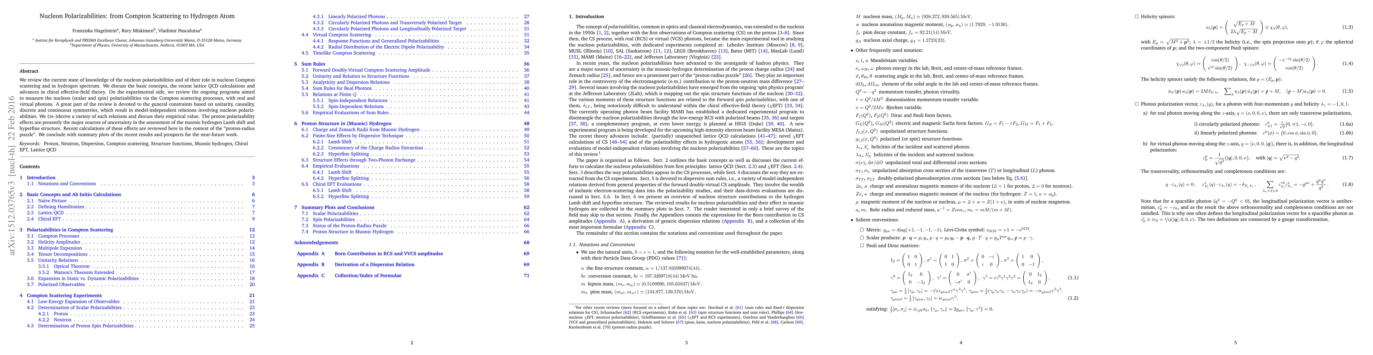 This paper reviews the current understanding of nucleon polarizabilities, focusing on their role in Compton scattering and hydrogen spectrum. It discusses recent lattice QCD calculations, chiral effective-field theory advances, and experimental efforts to measure these polarizabilities, emphasizing the importance of proton polarizability in the muonic hydrogen Lamb shift and the "proton-radius puzzle."