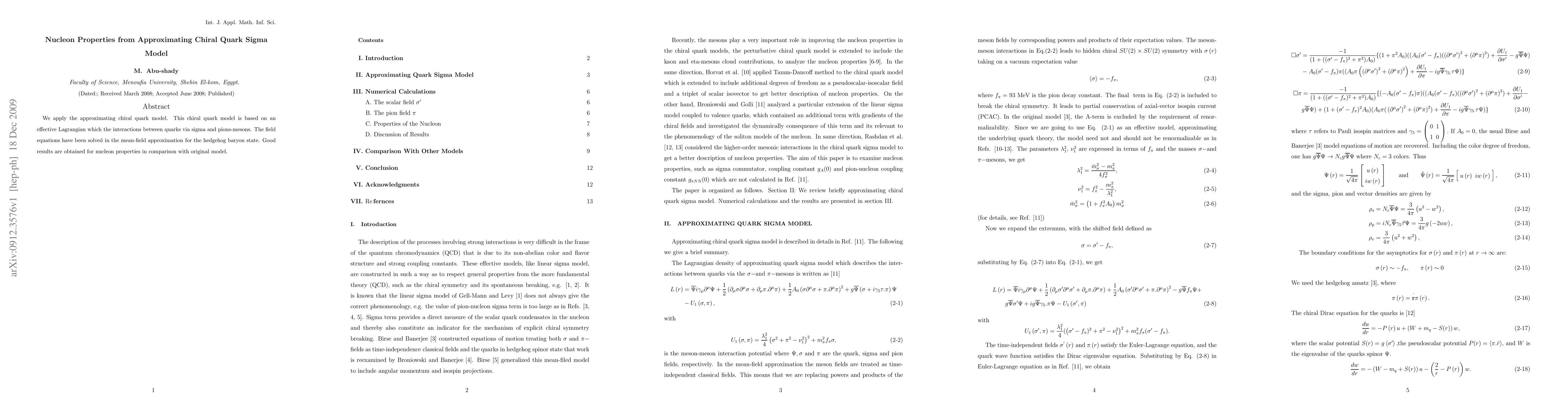 We apply the approximating chiral quark model. This chiral quark model is based on an effective Lagrangian which the interactions between quarks via sigma and pions mesons. The field equations have been solved in the mean field approximation for the hedgehog baryon state. Good results are obtained for nucleon properties in comparison with original model.