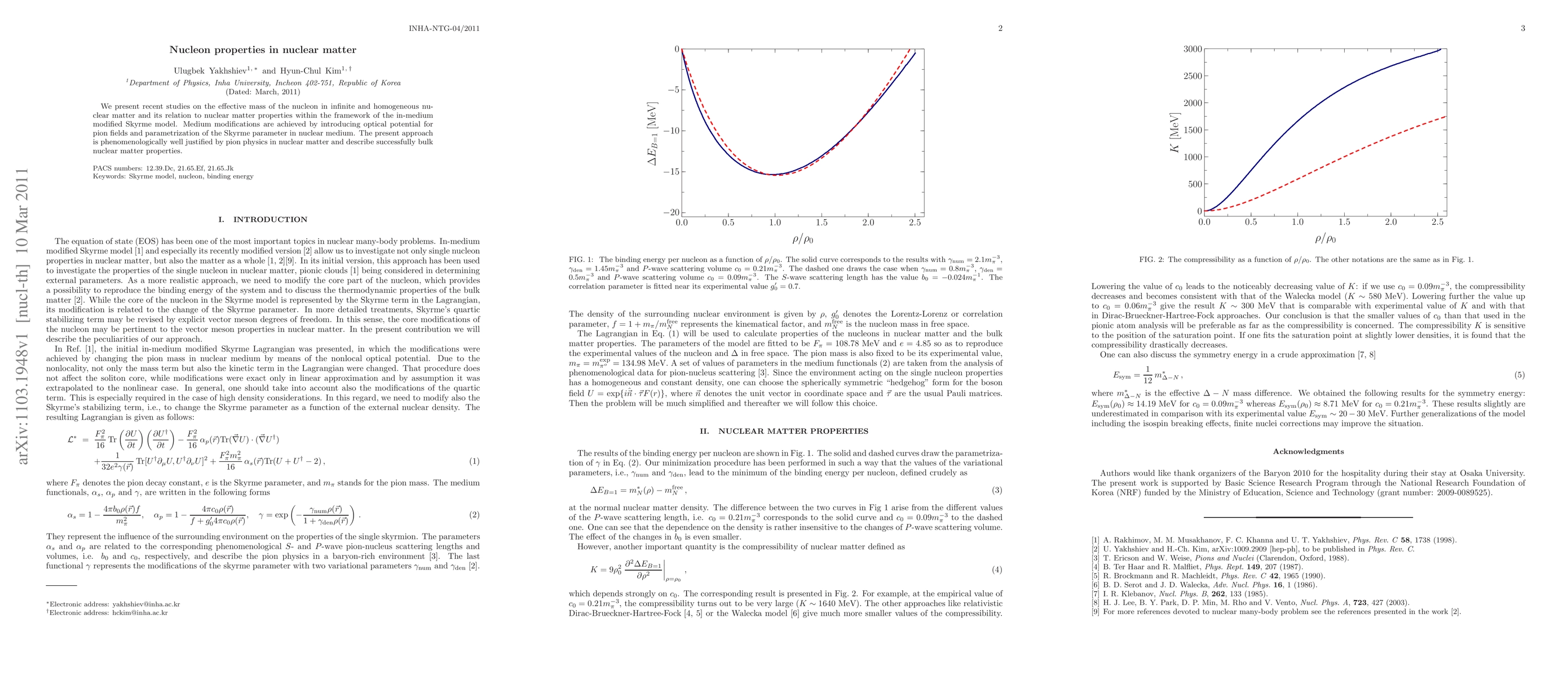 We present recent studies on the effective mass of the nucleon in infinite and homogeneous nuclear matter and its relation to nuclear matter properties within the framework of the in-medium modified Skyrme model. Medium modifications are achieved by introducing optical potential for pion fields and parametrization of the Skyrme parameter in nuclear medium. The present approach is phenomenologically well justified by pion physics in nuclear matter and describe successfully bulk nuclear matter properties.