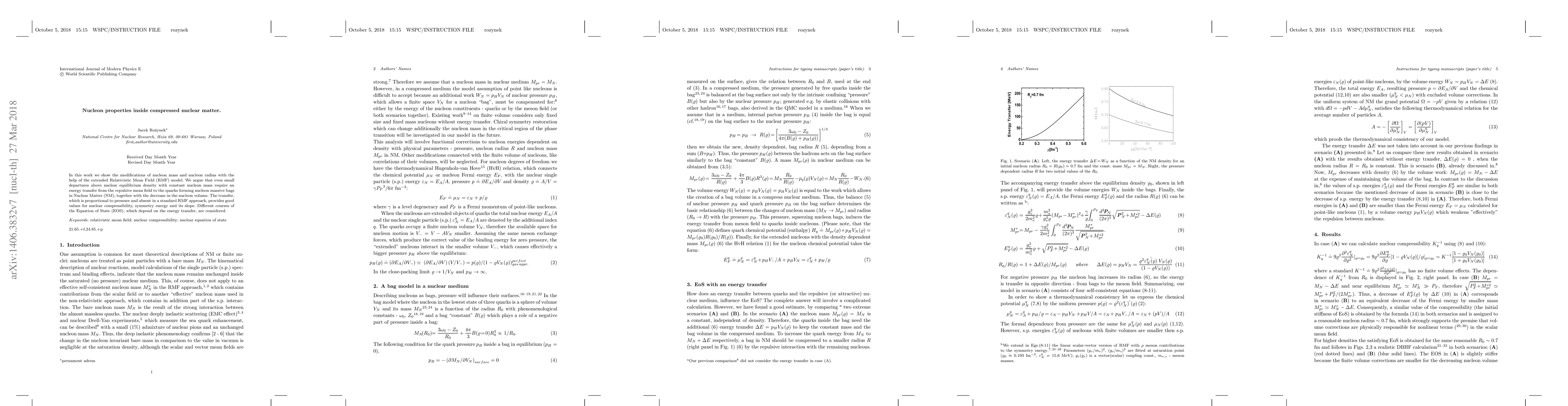 In this work we show the modifications of nucleon mass and nucleon radius with the help of the extended Relativistic Mean Field (RMF) model. We argue that even small departures above nuclear equilibrium density with constant nucleon mass require an energy transfer from the repulsive mean field to the quarks forming nucleon massive bags in Nuclear Matter (NM), together with the decrease in the nucleon volume. The transfer, which is proportional to pressure and absent in a standard RMF approach, provides good values for nuclear compressibility, symmetry energy and its slope. Different courses of the Equation of State (EOS), which depend on the energy transfer, are considered.