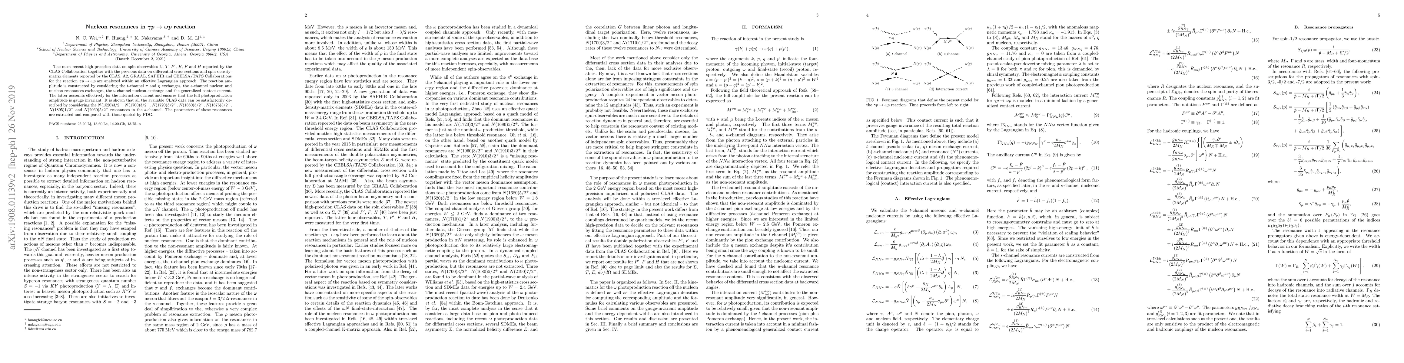 The most recent high-precision data on spin observables $\Sigma$, $T$, $P'$, $E$, $F$ and $H$ reported by the CLAS Collaboration together with the previous data on differential cross sections and spin-density-matrix elements reported by the CLAS, A2, GRAAL, SAPHIR and CBELSA/TAPS Collaborations for the reaction $\gamma p \to \omega p$ are analyzed within an effective Lagrangian approach. The reaction amplitude is constructed by considering the $t$-channel $\pi$ and $\eta$ exchanges, the $s$-channel nucleon and nucleon resonances exchanges, the $u$-channel nucleon exchange and the generalized contact current. The latter accounts effectively for the interaction current and ensures that the full photoproduction amplitude is gauge invariant. It is shown that all the available CLAS data can be satisfactorily described by considering the $N(1520)3/2^-$, $N(1700)3/2^-$, $N(1720)3/2^+$, $N(1860)5/2^+$, $N(1875)3/2^-$, $N(1895)1/2^-$ and $N(2060)5/2^-$ resonances in the $s$-channel. The parameters of these resonances are extracted and compared with those quoted by PDG.