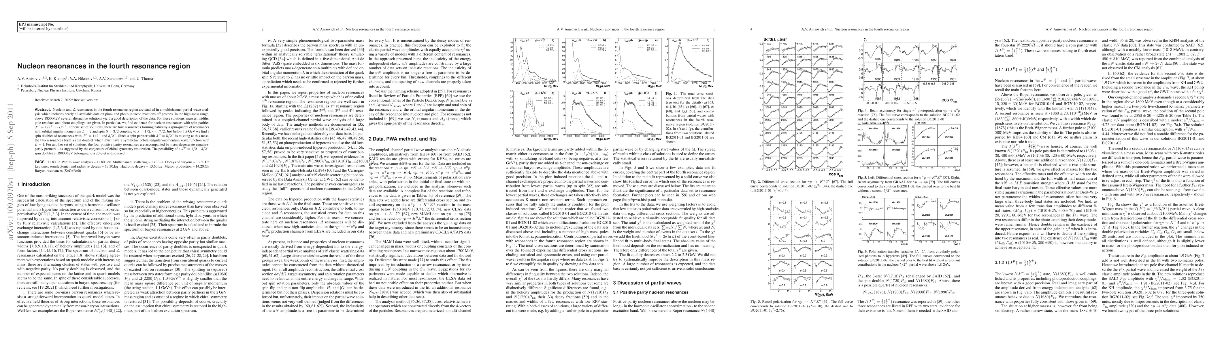Nucleon and $\Delta$ resonances in the fourth resonance region are studied in a multichannel partial-wave analysis which includes nearly all available data on pion- and photo-induced reactions off protons. In the high-mass range, above 1850\,MeV, several alternative solutions yield a good description of the data. For these solutions, masses, widths, pole residues and photo-couplings are given. In particular, we find evidence for nucleon resonances with spin-parities $J^P=1/2^+...7/2^+$. For one set of solutions, there are four resonances forming naturally a spin-quartet of resonances with orbital angular momentum L=2 and spin S=3/2 coupling to $J=1/2,...,7/2$. Just below 1.9\,GeV we find a spin doublet of resonances with $J^P=1/2^-$ and $3/2^-$. Since a spin partner with $J^P=5/2^-$ is missing at this mass, the two resonances form a spin doublet which must have a symmetric orbital-angular-momentum wave function with L=1. For another set of solutions, the four positive-parity resonances are accompanied by mass-degenerate negative-parity partners -- as suggested by the conjecture of chiral symmetry restoration. The possibility of a $J^P=1/2^+, 3/2^+$ spin doublet at 1900\,MeV belonging to a 20-plet is discussed.