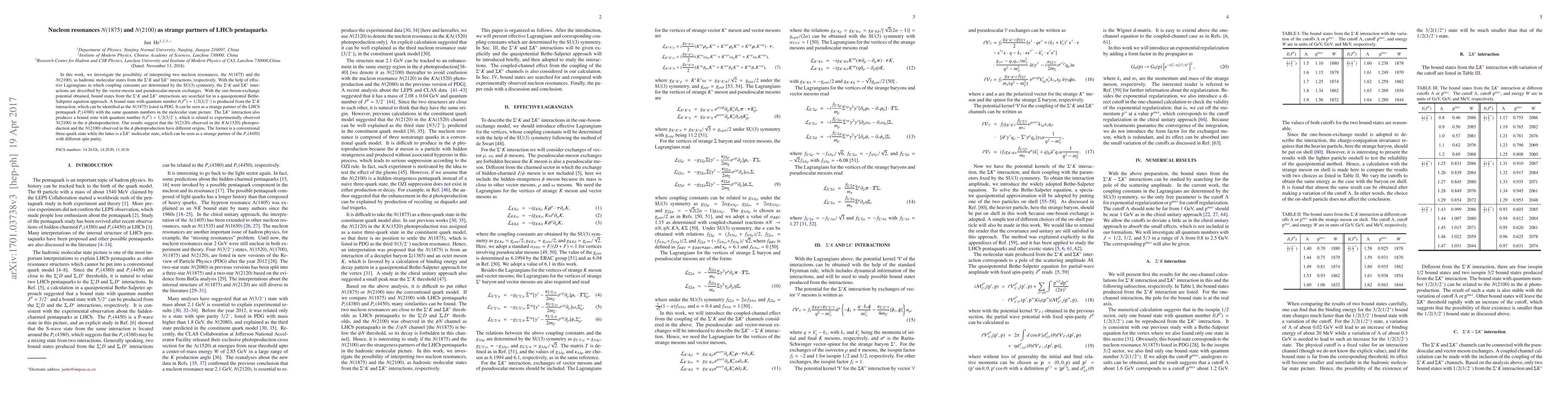 In this work, we investigate the possibility of interpreting two nucleon resonances, the $N(1875)$ and the $N(2100)$, as hadronic molecular states from the $\Sigma^*K$ and $\Sigma K^*$ interactions, respectively. With the help of effective Lagrangians in which coupling constants are determined by the SU(3) symmetry, the $\Sigma^*K$ and $\Sigma K^*$ interactions are described by the vector-meson and pseudoscalar-meson exchanges. With the one-boson-exchange potential obtained, bound states from the $\Sigma^*K$ and $\Sigma K^*$ interactions are searched for in a quasipotential Bethe-Saltpeter equation approach. A bound state with quantum number $I(J^P)=1/2(3/2^-)$ is produced from the $\Sigma^*K$ interaction, which can be identified as the $N(1875)$ listed in PDG. It can be seen as a strange partner of the LHCb pentaquark $P_c(4380)$ with the same quantum numbers in the molecular state picture. The $\Sigma K^*$ interaction also produces a bound state with quantum number $I(J^P)=1/2(3/2^-)$, which is related to experimentally observed $N(2100)$ in the $\phi$ photoproduction. Our results suggest that the $N(2120)$ observed in the $K\Lambda(1520)$ photoproduction and the $N(2100)$ observed in the $\phi$ photoproduction have different origins. The former is a conventional three-quark state while the latter is a $\Sigma K^*$ molecular state, which can be seen as a strange partner of the $P_c(4450)$ with different spin parity.