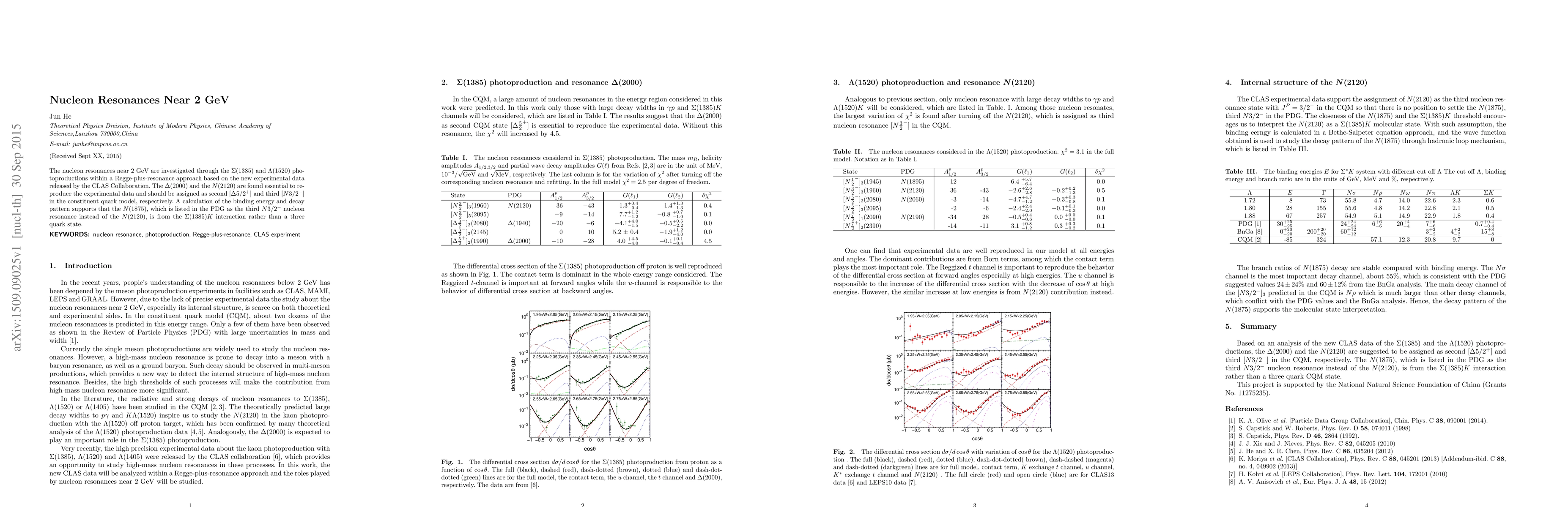 The nucleon resonances near 2 GeV are investigated through the $\Sigma$(1385) and $\Lambda(1520)$ photoproductions within a Regge-plus-resonance approach based on the new experimental data released by the CLAS Collaboration. The $\Delta(2000)$ and the $N(2120)$ are found essential to reproduce the experimental data and should be assigned as second $[\Delta 5/2^+]$ and third $[N3/2^-]$ in the constituent quark model, respectively. A calculation of the binding energy and decay pattern supports that the $N(1875)$, which is listed in the PDG as the third $N3/2^-$ nucleon resonance instead of the $N(2120)$, is from the $\Sigma(1385)K$ interaction rather than a three quark state.