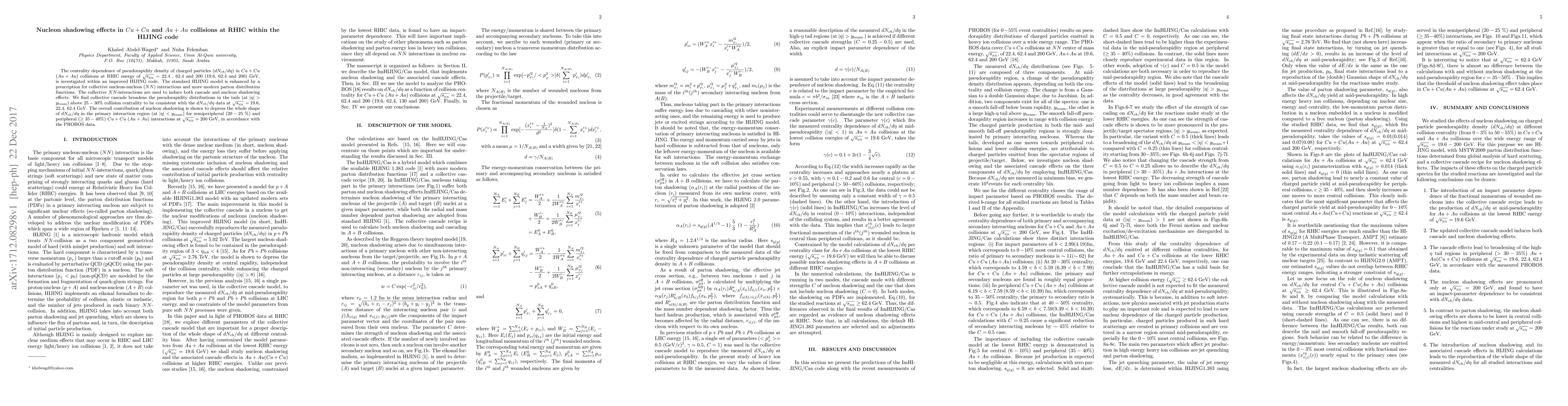 The centrality dependence of pseudorapidity density of charged particles ($ dN_{ch}/d\eta $) in $Cu+Cu$ ($Au+Au$) collisions at RHIC energy of $ \sqrt{s_{_{\rm NN}}}=22.4$ , $62.4 $ and $200$ ($19.6$, $62.4$ and $200$) GeV, is investigated within an improved HIJING code. The standard HIJING model is enhanced by a prescription for collective nucleon-nucleon ($NN$) interactions and more modern parton distribution functions. The collective $NN$-interactions are used to induce both cascade and nucleon shadowing effects. We find collective cascade broadens the pseudorapidity distributions in the tails (at $ |\eta|> y_{\rm beam} $) above $25-30\%$ collision centrality to be consistent with the $ dN_{ch}/d\eta $ data at $ \sqrt{s_{_{\rm NN}}}=19.6$, $22.4$, $62.4 $ GeV. The overall contribution of nucleon shadowing is shown to depress the whole shape of $ dN_{ch}/d\eta$ in the primary interaction region (at $ |\eta|< y_{\rm beam} $) for semiperipheral ($ 20-25 $ \%) and peripheral ($\ge 35-40$\%) $Cu+Cu$ ($Au+Au$) interactions at $ \sqrt{s_{_{\rm NN}}}=200$ GeV, in accordance with the PHOBOS data.
