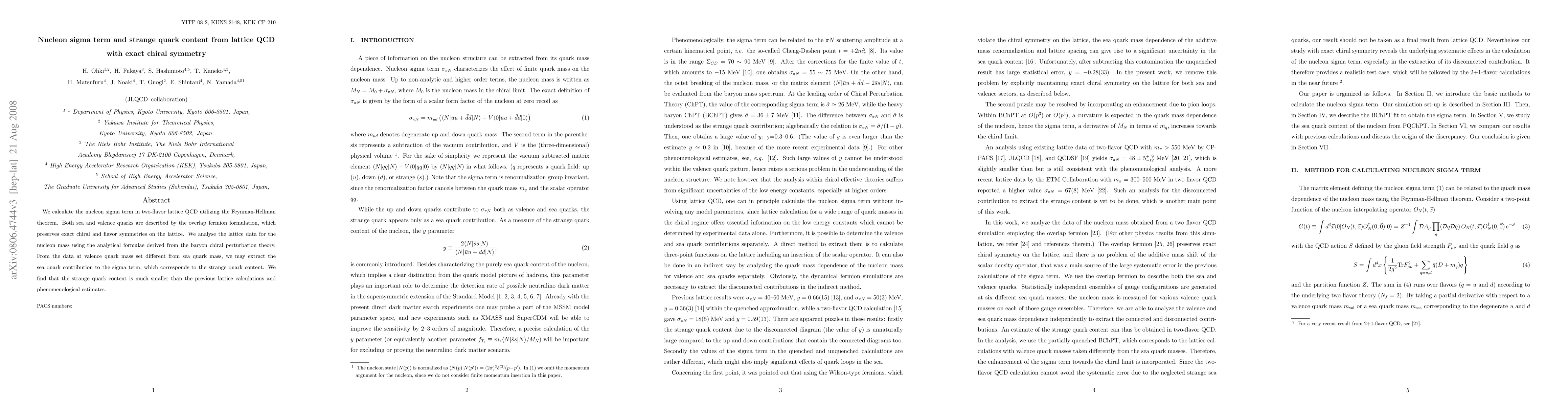 This study calculates the nucleon sigma term using two-flavor lattice QCD with exact chiral symmetry, revealing a smaller strange quark content than previous estimates. The analysis employs the Feynman-Hellman theorem and the overlap fermion formulation to distinguish between sea and valence quark contributions.