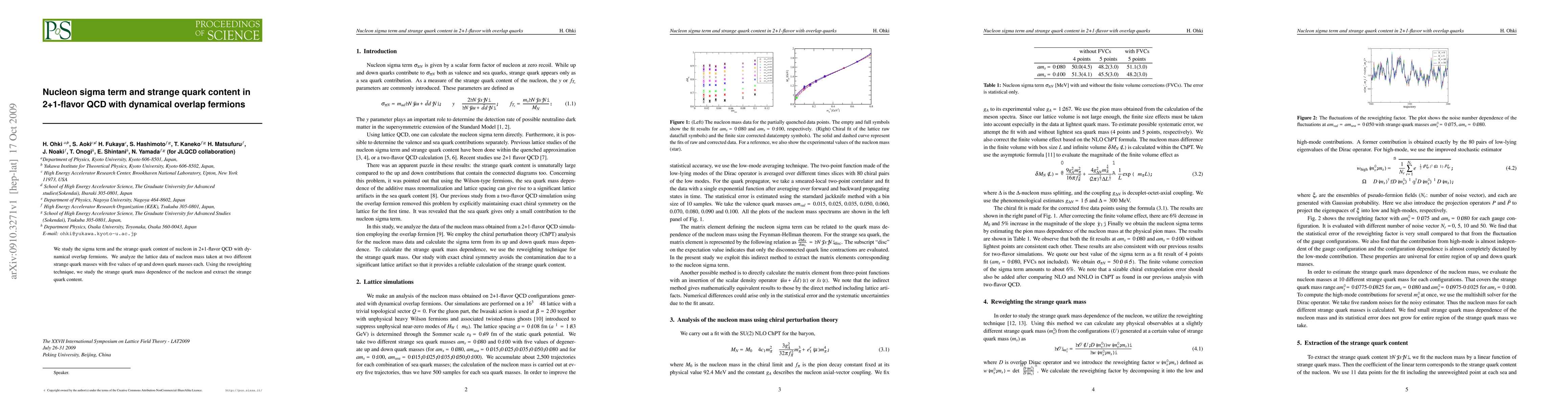 This paper investigates the nucleon sigma term and strange quark content using 2+1-flavor QCD with dynamical overlap fermions. The study analyzes lattice data from nucleon masses at varying strange and up/down quark masses, employing reweighting to determine the strange quark's contribution.