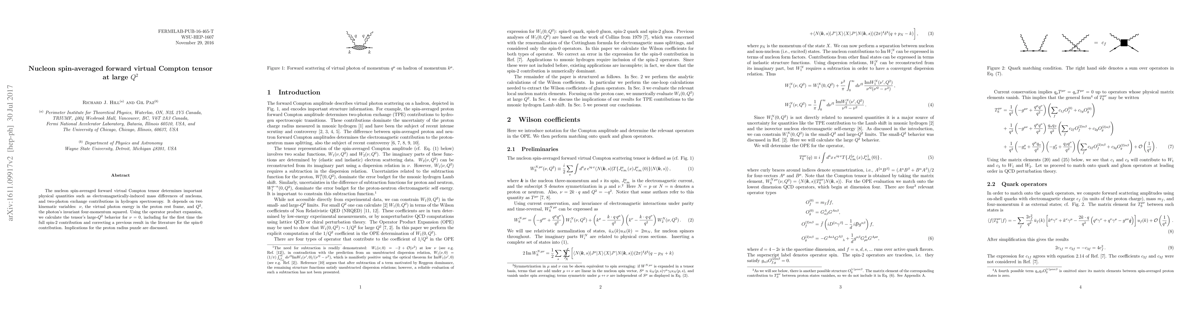 The nucleon spin-averaged forward virtual Compton tensor determines important physical quantities such as electromagnetically-induced mass differences of nucleons, and two-photon exchange contributions in hydrogen spectroscopy. It depends on two kinematic variables: $\nu$, the virtual photon energy in the proton rest frame, and $Q^2$, the photon's invariant four-momentum squared. Using the operator product expansion, we calculate the tensor's large-$Q^2$ behavior for $\nu=0$, including for the first time the full spin-2 contribution and correcting a previous result in the literature for the spin-0 contribution. Implications for the proton radius puzzle are discussed.