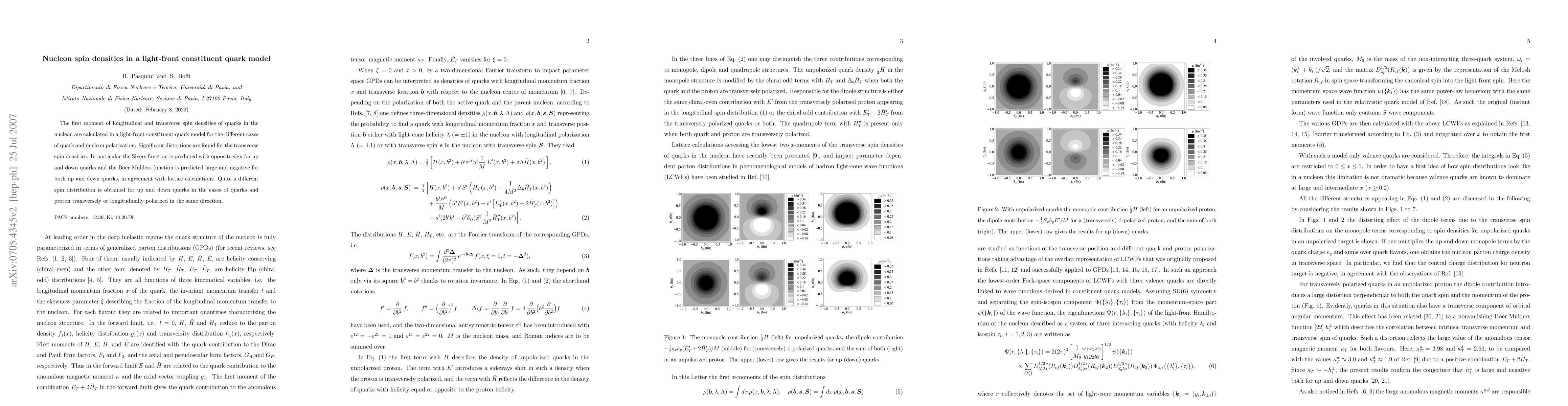 The first moment of longitudinal and transverse spin densities of quarks in the nucleon are calculated in a light-front constituent quark model for the different cases of quark and nucleon polarization. Significant distortions are found for the transverse spin densities. In particular the Sivers function is predicted with opposite sign for up and down quarks and the Boer-Mulders function is predicted large and negative for both up and down quarks, in agreement with lattice calculations. Quite a different spin distribution is obtained for up and down quarks in the cases of quarks and proton transversely or longitudinally polarized in the same direction.