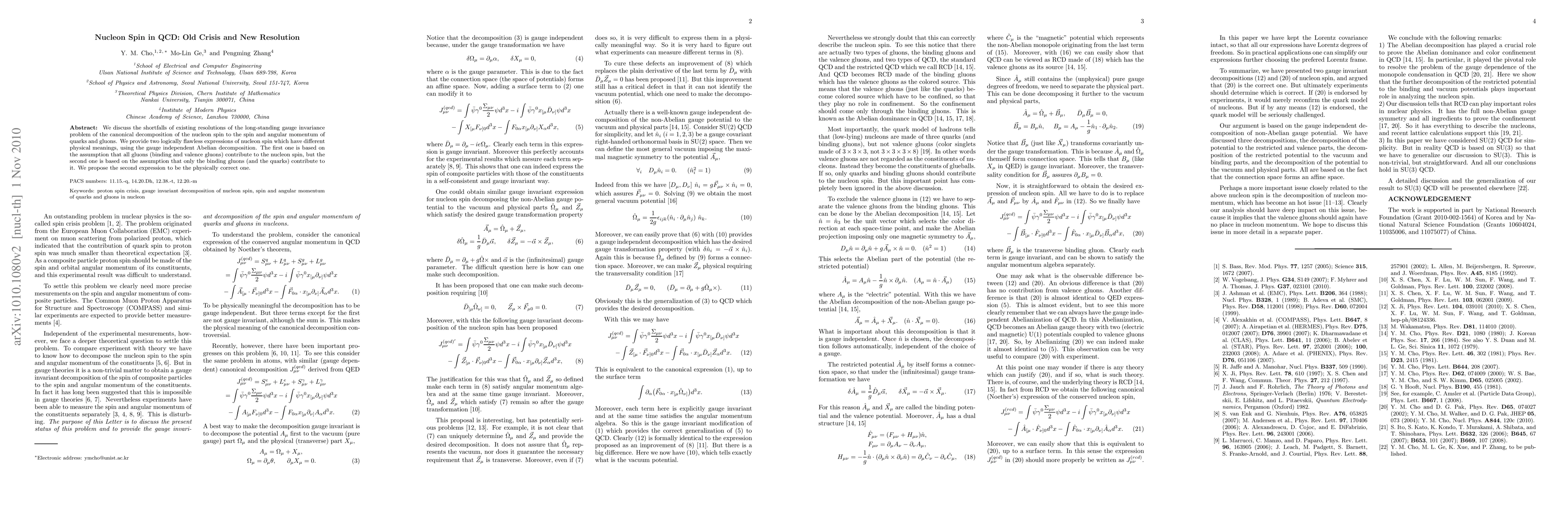We discuss the shortfalls of existing resolutions of the long-standing gauge invariance problem of the canonical decomposition of the nucleon spin to the spin and angular momentum of quarks and gluons. We provide two logically flawless expressions of nucleon spin which have different physical meanings, using the gauge independent Abelian decomposition. The first one is based on the assumption that all gluons (binding and valence gluons) contribute to the nucleon spin, but the second one is based on the assumption that only the binding gluons (and the quarks) contribute to it. We propose the second expression to be the physically correct one.
