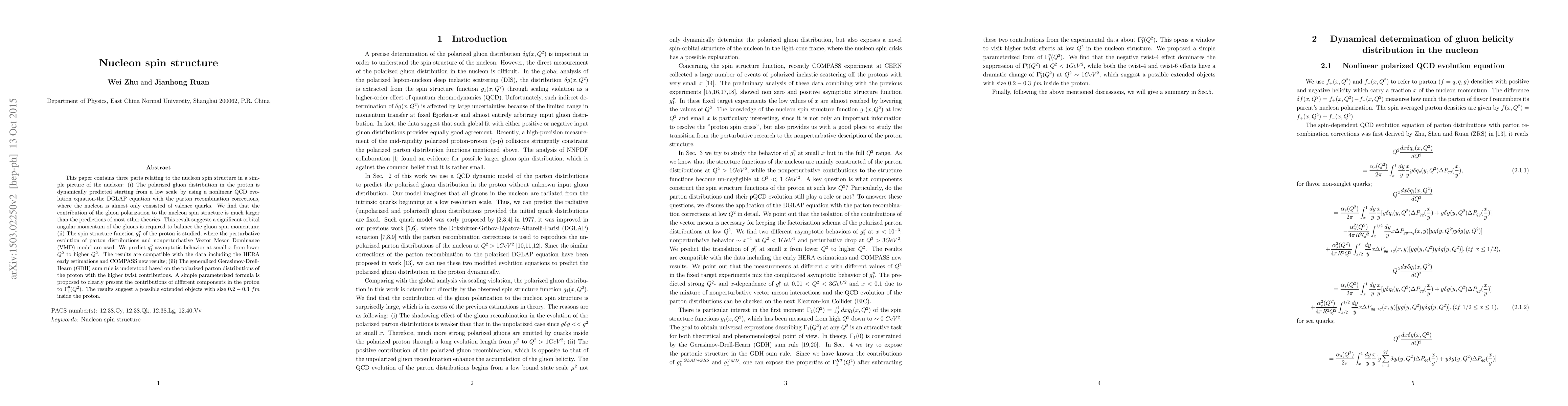 This paper explores the nucleon spin structure through three parts: (i) It predicts a significant gluon polarization contribution to the nucleon spin, suggesting substantial gluon orbital angular momentum. (ii) It studies the proton spin structure function $g_1^p$ and predicts its behavior at small $x$, compatible with experimental data. (iii) It analyzes the generalized Gerasimov-Drell-Hearn sum rule, proposing a formula that indicates possible extended objects within the proton.