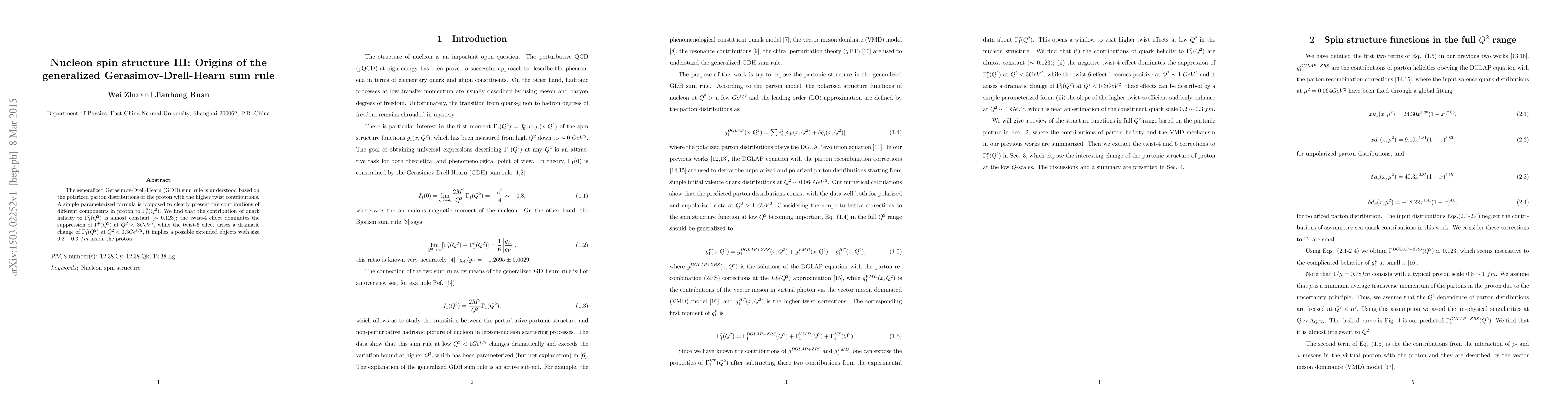 This research investigates the generalized Gerasimov-Drell-Hearn sum rule, attributing its origins to proton's polarized parton distributions and higher twist contributions. A parameterized formula is proposed to illustrate component contributions to $Gamma_1^p(Q^2)$. Key findings include quark helicity contributing constantly (~0.123), twist-4 effects dominating suppression at lower $Q^2$, and twist-6 effects causing significant changes at even lower $Q^2$, suggesting extended objects of 0.2-0.3 fm within the proton.