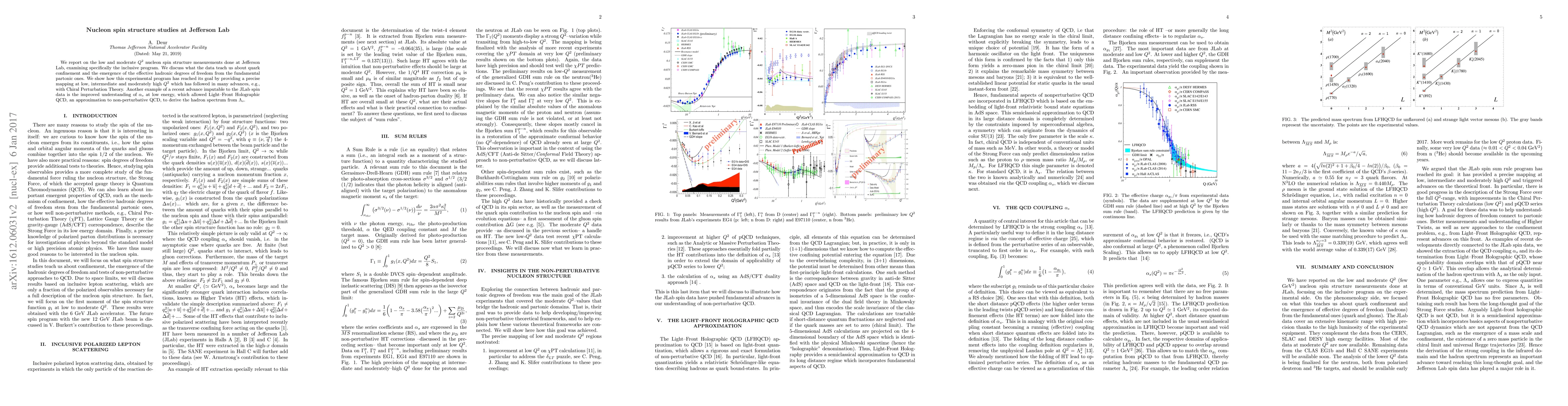 We report on the low and moderate Q^2 nucleon spin structure measurements done at Jefferson Lab, examining specifically the inclusive program. We discuss what the data teach us about quark confinement and the emergence of the effective hadronic degrees of freedom from the fundamental partonic ones. We show how this experimental program has reached its goal by providing a precise mapping at low, intermediate and moderately high Q^2 which has followed in many advances, e.g., with Chiral Perturbation Theory. Another example of a recent advance imputable to the JLab spin data is the improved understanding of \alpha_s at low energy, which allowed Light-Front Holographic QCD, an approximation to non-perturbative QCD, to derive the hadron spectrum from \Lambda_s.