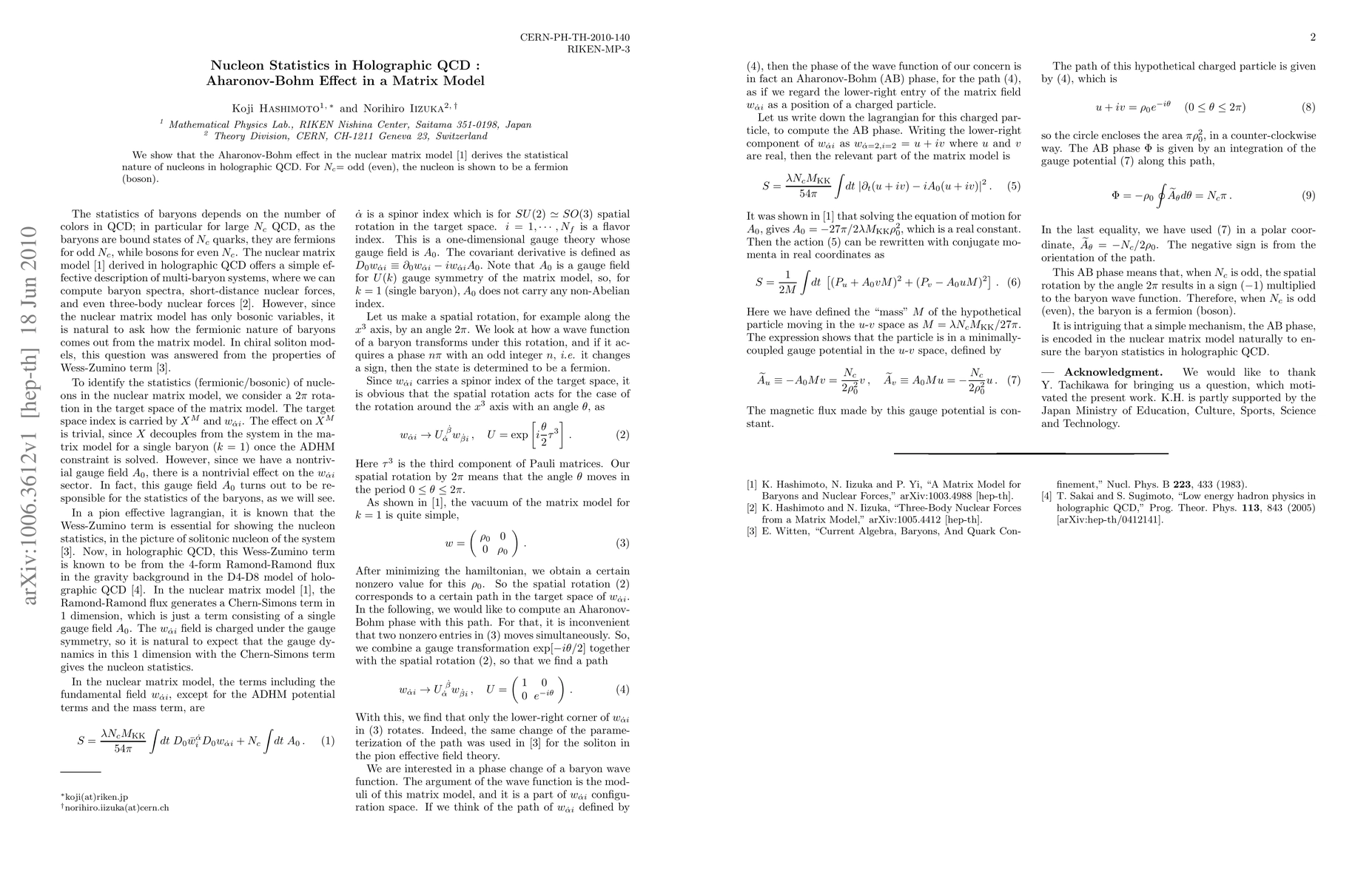 We show that the Aharonov-Bohm effect in the nuclear matrix model derives the statistical nature of nucleons in holographic QCD. For N_c= odd (even), the nucleon is shown to be a fermion (boson).