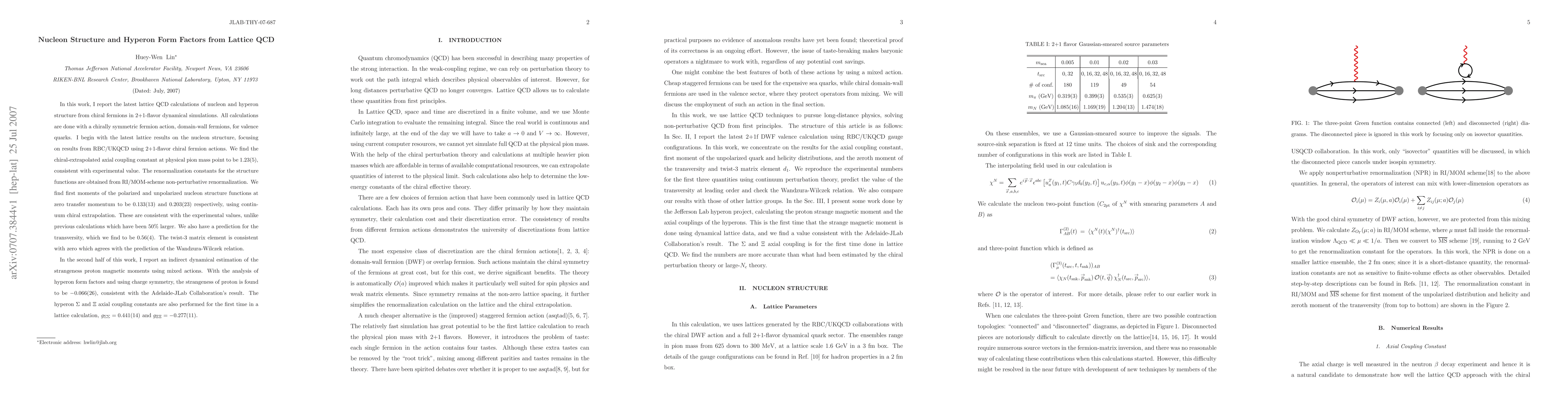 This paper presents lattice QCD calculations of nucleon and hyperon structure using chiral fermions, finding the axial coupling constant and structure functions consistent with experimental values. It also reports the first lattice estimations for hyperon axial coupling constants and the strangeness content of the proton.