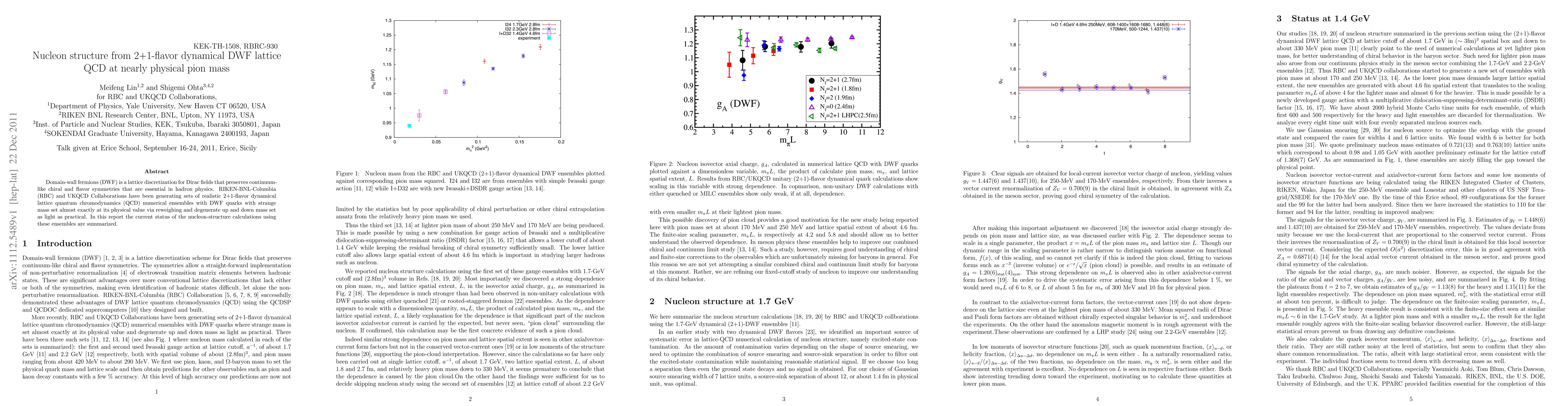Domain-wall fermions (DWF) is a lattice discretization for Dirac fields that preserves continuum-like chiral and flavor symmetries that are essential in hadron physics. RIKEN-BNL-Columbia (RBC) and UKQCD Collaborations have been generating sets of realistic 2+1-flavor dynamical lattice quantum chromodynamics (QCD) numerical ensembles with DWF quarks with strange mass set almost exactly at its physical value via reweighing and degenerate up and down mass set as light as practical. In this report the current status of the nucleon-structure calculations using these ensembles are summarized.