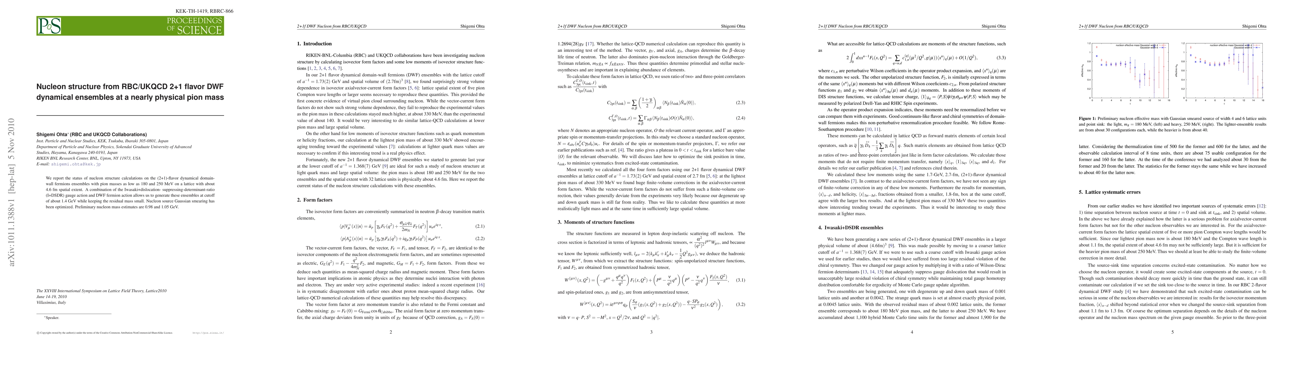 This study reports nucleon structure calculations using 2+1 flavor dynamical domain-wall fermions on lattices with nearly physical pion masses of 180 and 250 MeV. The Iwasaki+DSDR gauge action and optimized Gaussian smearing provide accurate nucleon mass estimates of 0.98 and 1.05 GeV.