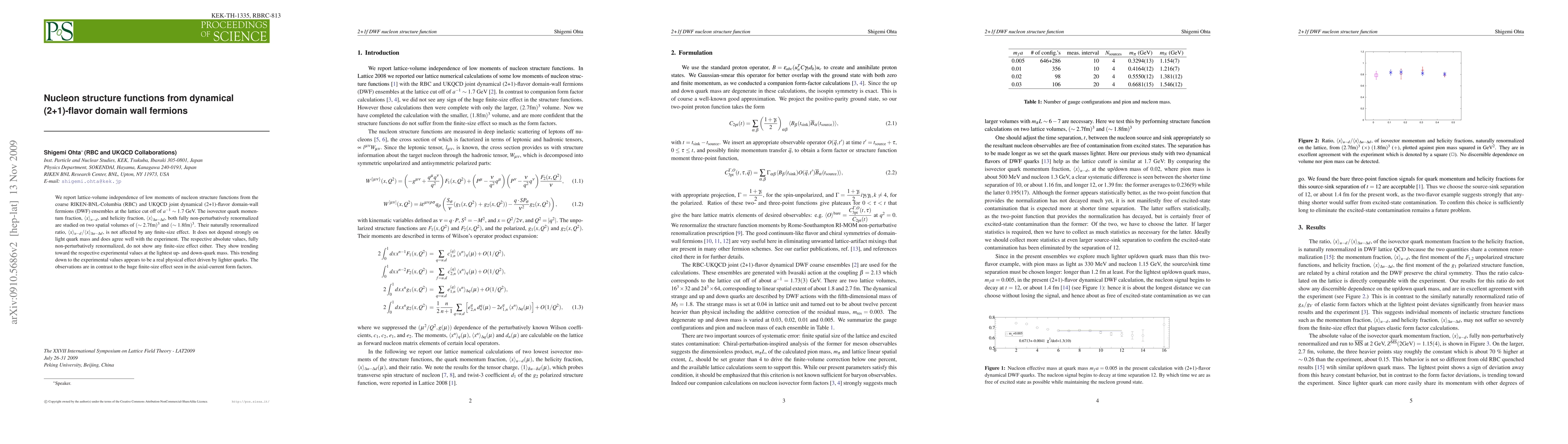 We report lattice-volume independence of low moments of nucleon structure functions from the coarse RIKEN-BNL-Columbia (RBC) and UKQCD joint dynamical (2+1)-flavor domain-wall fermions (DWF) ensembles at the lattice cut off of (a^{-1}\sim1.7) GeV. The isovector quark momentum fraction, (< x >_{u-d}), and helicity fraction, (< x >_{\Delta u - \Delta d}), both fully non-perturbatively renormalized are studied on two spatial volumes of ((\sim {\rm 2.7 fm})^3) and ((\sim {\rm 1.8 fm})^3). Their naturally renormalized ratio, (< x >_{u-d}/< x >_{\Delta u - \Delta d}), is not affected by any finite-size effect. It does not depend strongly on light quark mass and does agree well with the experiment. The respective absolute values, fully non-perturbatively renormalized, do not show any finite-size effect either. They show trending toward the respective experimental values at the lightest up- and down-quark mass. This trending down to the experimental values appears to be a real physical effect driven by lighter quarks. The observations are in contrast to the huge finite-size effect seen in the axial-current form factors.