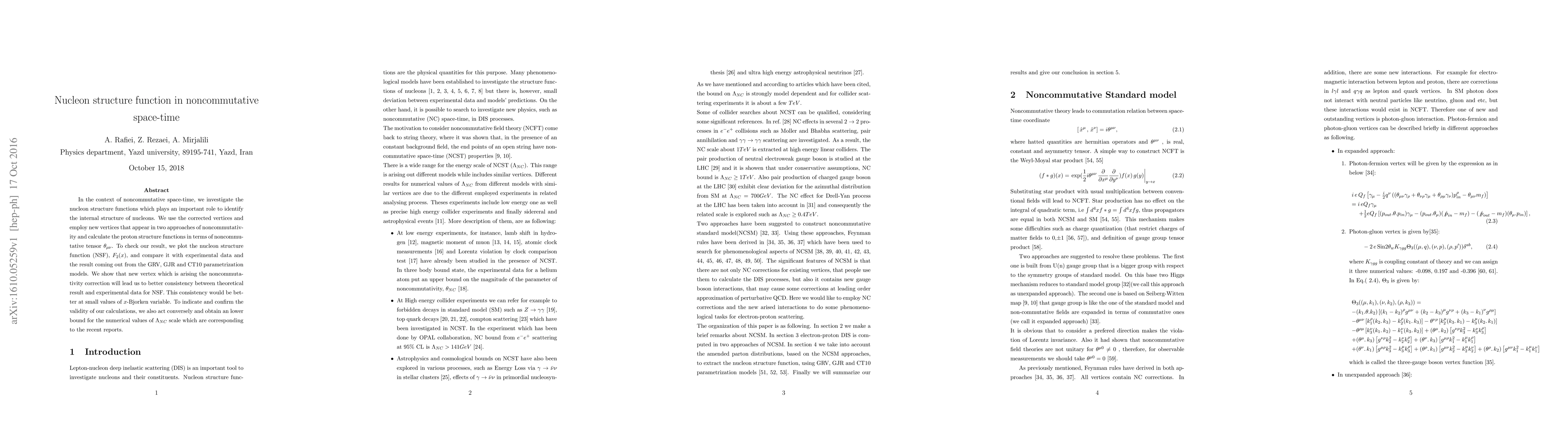 In the context of noncommutative space-time, we investigate the nucleon structure functions which plays an important role to identify the internal structure of nucleons. We use the corrected vertices and employ new vertices that appear in two approaches of noncommutativity and calculate the proton structure functions in terms of noncommutative tensor \theta_{\mu\nu}. To check our result, we plot the nucleon structure function (NSF), F_2(x), and compare it with experimental data and the result coming out from the GRV, GJR and CT10 parametrization models. We show that new vertex which is arising the noncommutativity correction will lead us to better consistency between theoretical result and experimental data for NSF. This consistency would be better at small values of x-Bjorken variable. To indicate and confirm the validity of our calculations, we also act conversely and obtain an lower bound for the numerical values of \Lambda_{NC} scale which are corresponding to the recent reports.